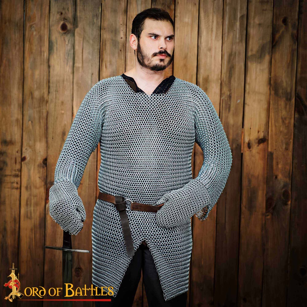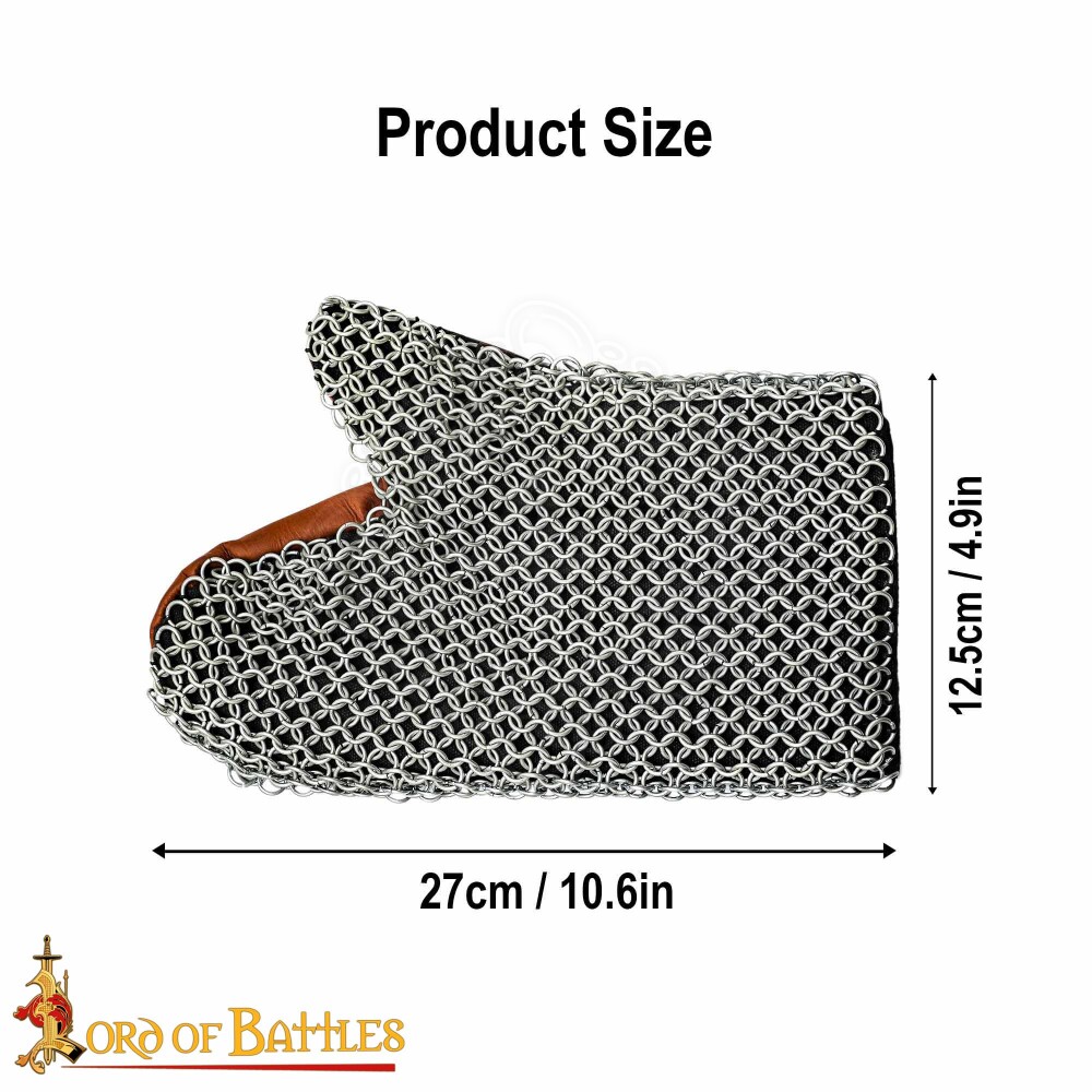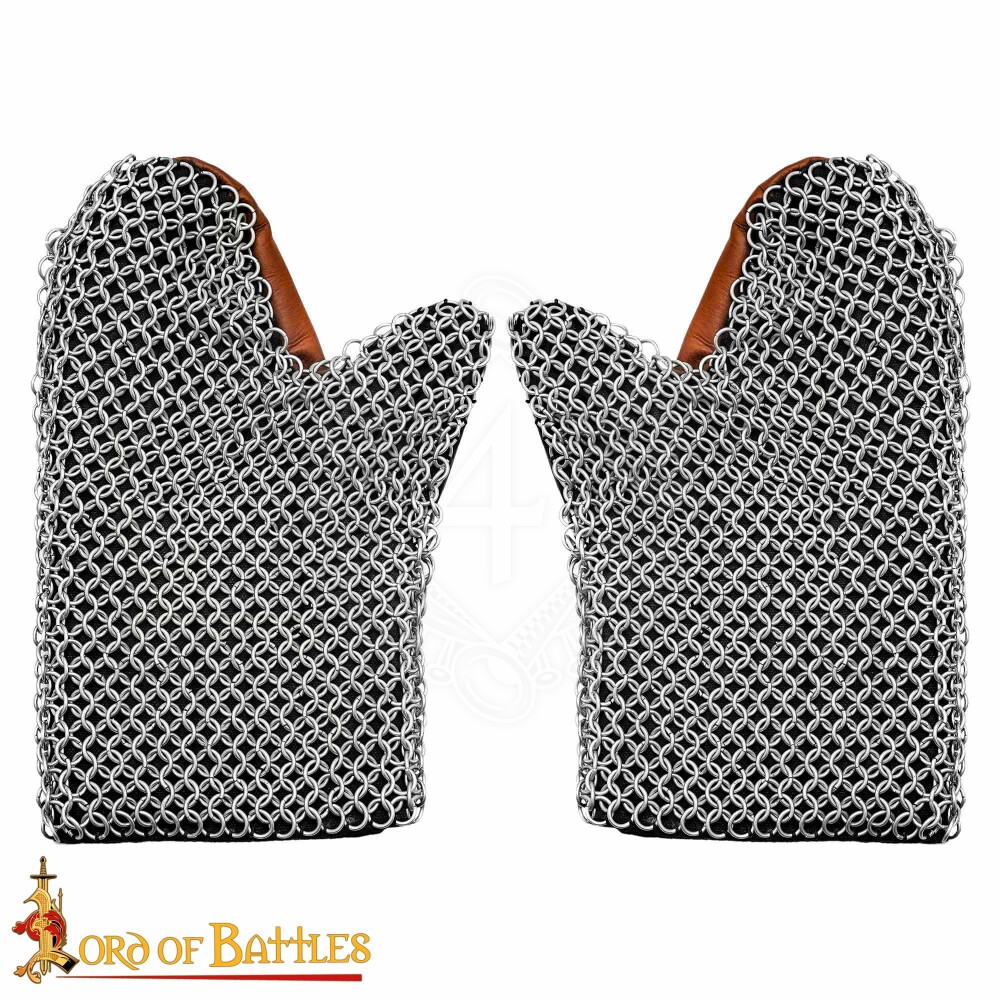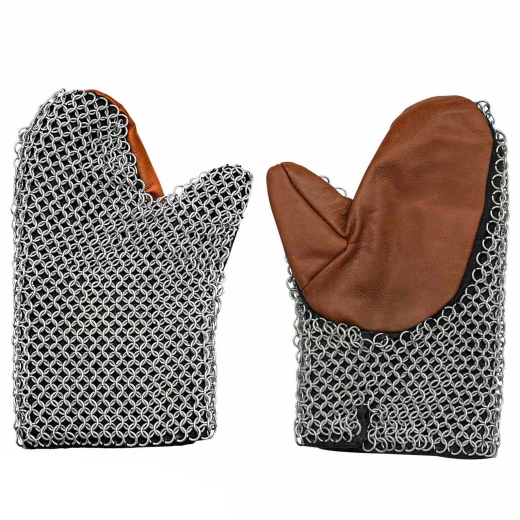 Pletivo je vyrobeno ze sražených (butted) ocelových kroužků o vnitřním průměru 8 mm. Tento typ je ideální pro reenactment a LARP – nabízí autentický vzhled za velmi příznivou cenu. Největší výhodou je však dlaňová část z odolné pravé kůže. Na rozdíl od celokroužkových rukavic, které mohou na jílci klouzat, ti kožená dlaň poskytne naprosto jistý a pevný úchop. Podkladová rukavice je navíc vyrobena z pevného plátna pro maximální komfort a odolnost.