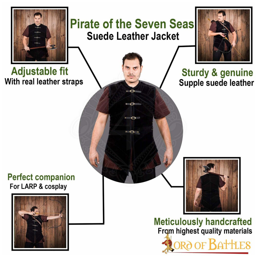 Tato stylová černá vesta z pravé semišové kůže je jako stvořená pro odvážné bukanýry, piráty sedmi moří, ale i pro náročné střelce z luku či jiné dobrodruhy. Představuje ideální součást tvého kostýmu na LARP, cosplay akci, historický festival či tématickou párty. Poskytne ti ochranu při běžných šarvátkách a zároveň tě nezatíží jako těžká plechová zbroj. Díky důmyslným rozparkům vpředu, vzadu i na bocích nebude tvůj pohyb nijak omezován, ať už se pustíš do šermu nebo budeš zdolávat palubu lodi. Poddajná semišová kůže činí nošení velmi příjemným, takže v této vestě budeš nejen skvěle vypadat, ale i se výborně cítit. Tak hurá za dobrodružstvím! Více informací k produktu ...