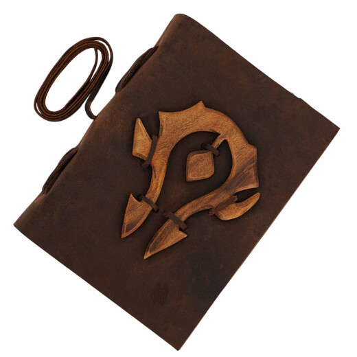- Ikonický design: Přední desce dominuje pečlivě vyřezávaný dřevěný emblém Hordy, který je pevně přichycen ke koženému obalu.
