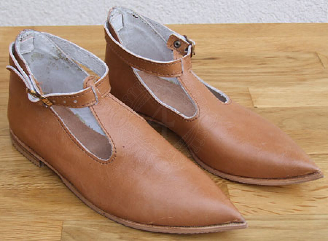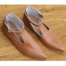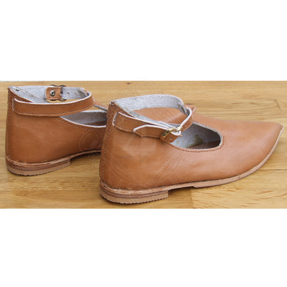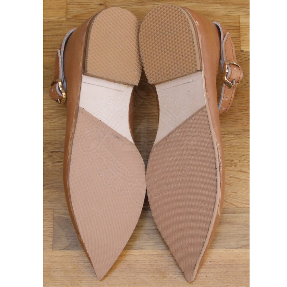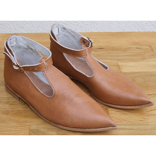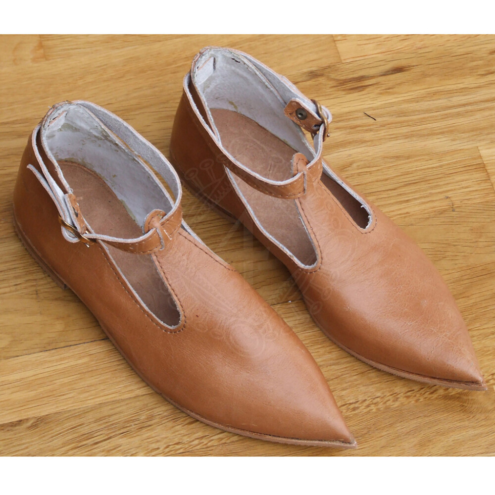 Nízké historické střevíčky ve stylu gotiky jsou špičaté, vystřižené a opatřené řemínkem na zapínání.