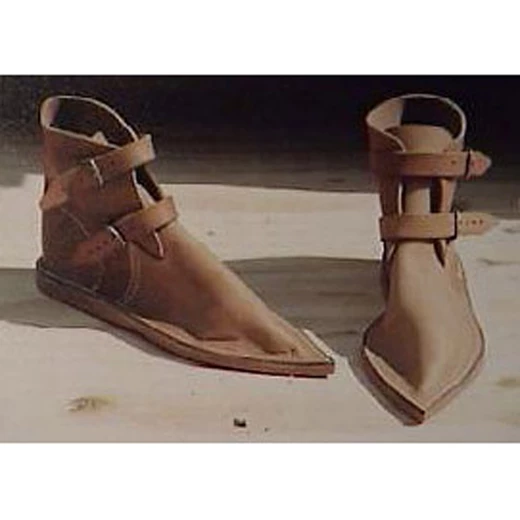 Nízké boty ve stylu gotiky jsou zašpičatělé a zapínají se na řemínky a přezky.