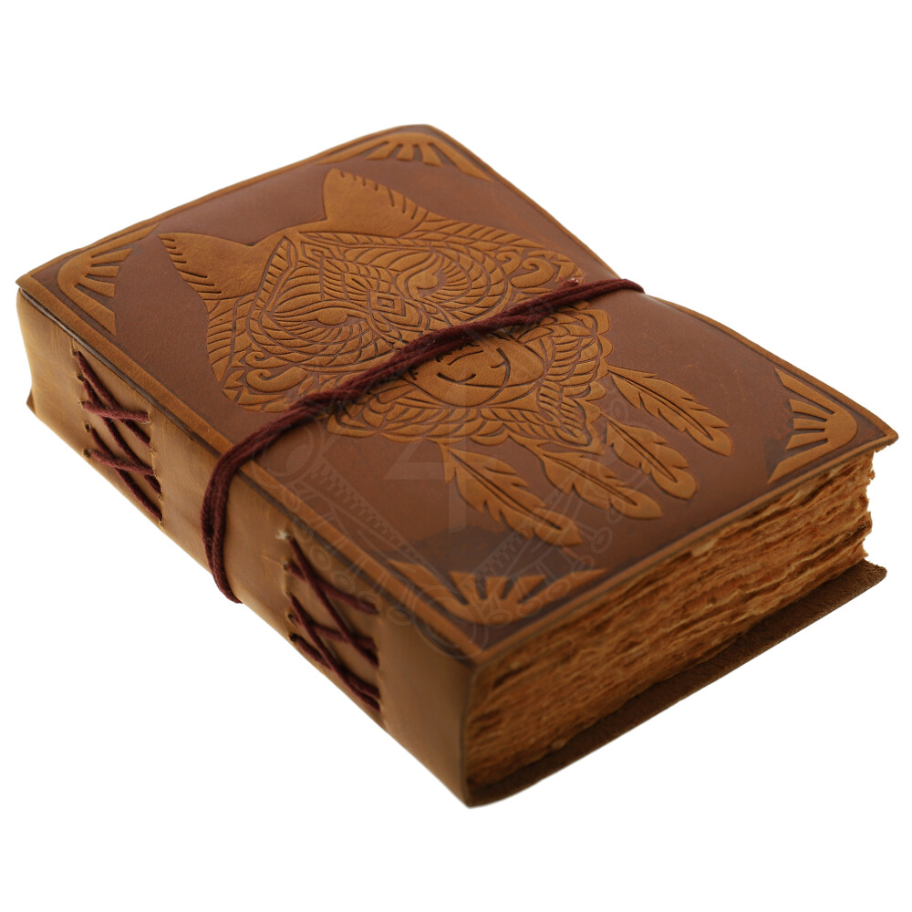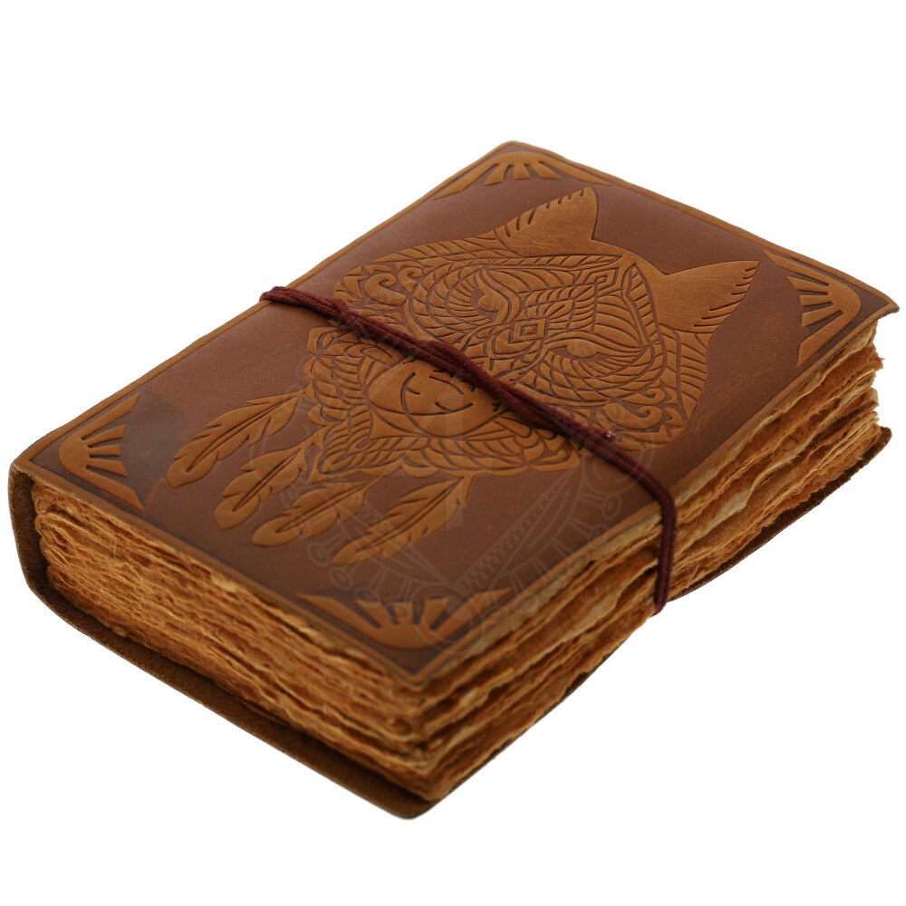 Kožený zápisník s vyraženým vlčím lapačem snů a starožitným ručním papírem
