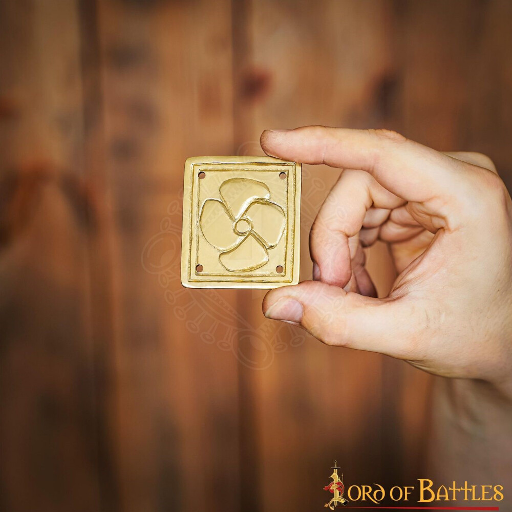 Tato sada římských plíšků na okování opasku je vyrobena z čisté mosazi a měří přibližně 5,8 cm na délku a 5 cm na šířku. Dodávka včetně 12 nýtů.