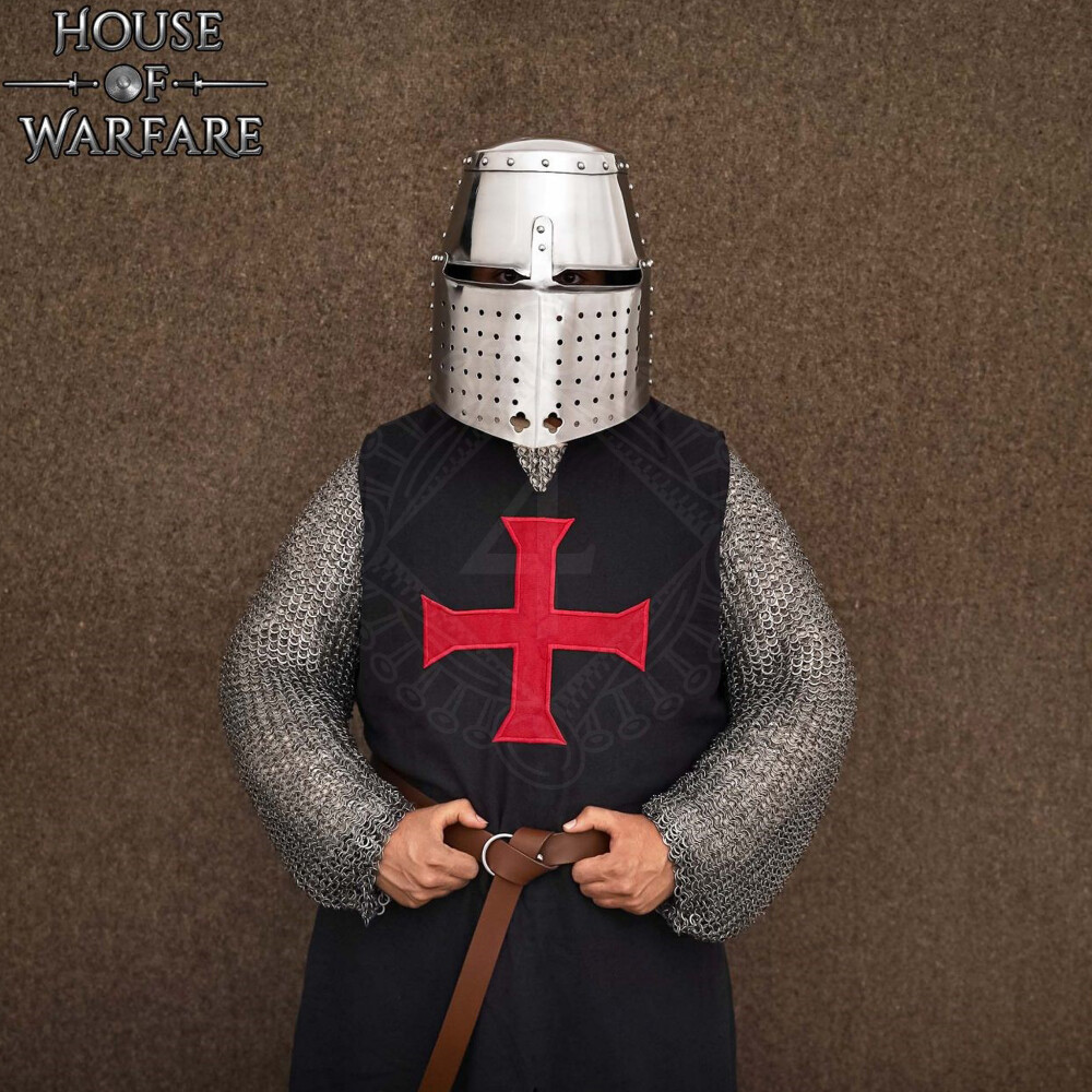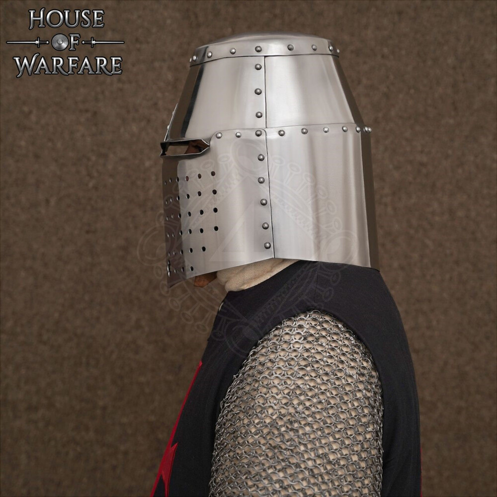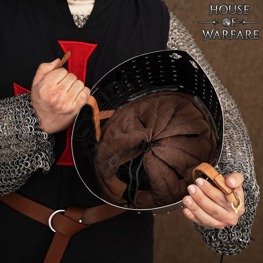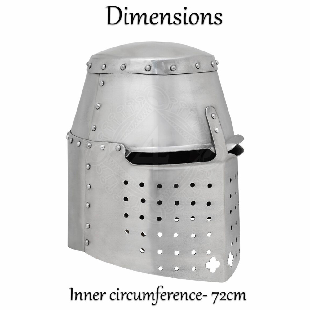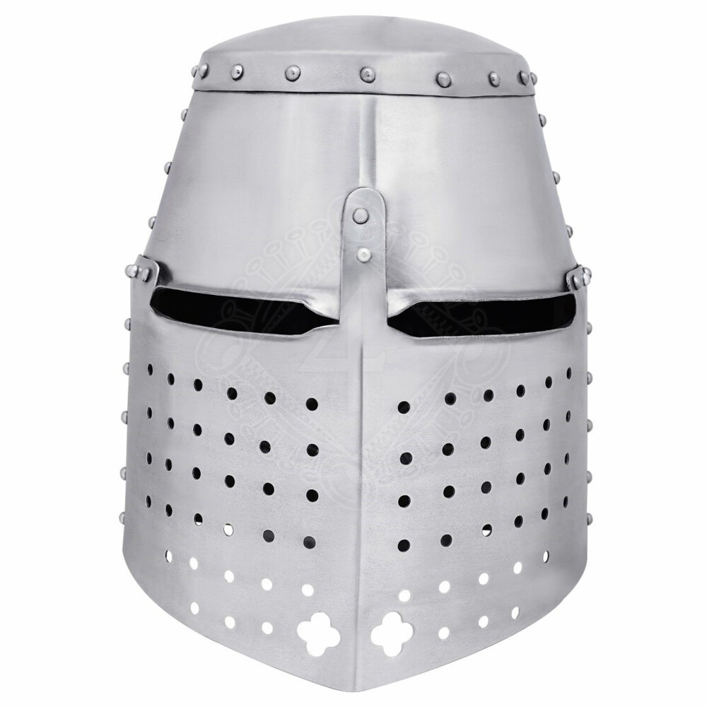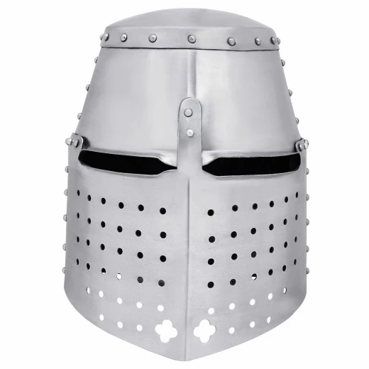 Tato rytířská přilba věrně kopíruje design vrcholně středověkých hrncových helem. Charakterizuje ji typický cylindrický tvar s plochým temenem, které je zpevněno nýtovanými pásy. Přední část, chránící obličej, je vybavena úzkými obdélníkovými průzory pro co nejlepší rozhled v boji. Dýchání usnadňuje perforace v podobě mnoha malých otvorů. Jako dekorativní i funkční prvek jsou zde navíc dva větší otvory ve tvaru tlapatého kříže. Uvnitř helmy najdeš kompletní, měkce polstrovanou výstelku a kožený řemínek s mosaznou přezkou pro pevné a pohodlné usazení na hlavě.