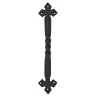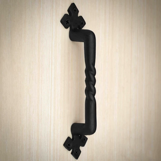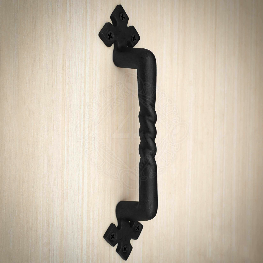 Madlo má robustní, zaoblený tvar písmene „U“, který skvěle padne do ruky. Střední část rukojeti je zdobena výrazným spirálovitým zkroucením, které je příjemné na dotek a lahodí oku. Každý konec madla je připevněn k ozdobné montážní desce ve tvaru gotického trojlístku. Každá deska má tři otvory pro šrouby, což zajišťuje velmi pevné a stabilní uchycení. Celý kus je odlit z oceli a má rustikální černěnou povrchovou úpravu.