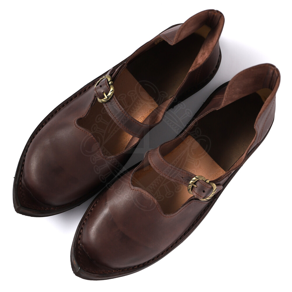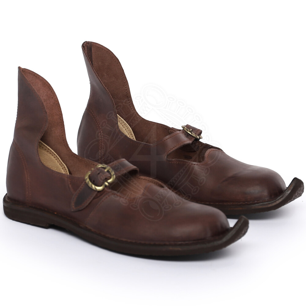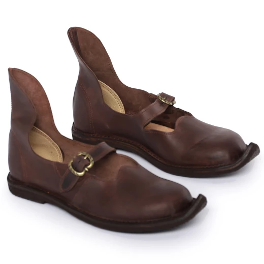 12. - 15. stol. Dámské střevíce ve stylu gotiky jsou výrazně zašpičatělé, nad patou sahají ke kotníkům a přes nárt jsou upevněné řemínkem a přezkou.