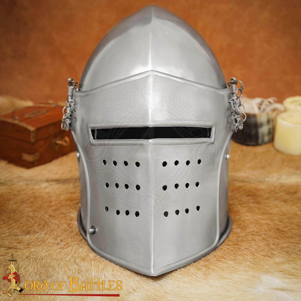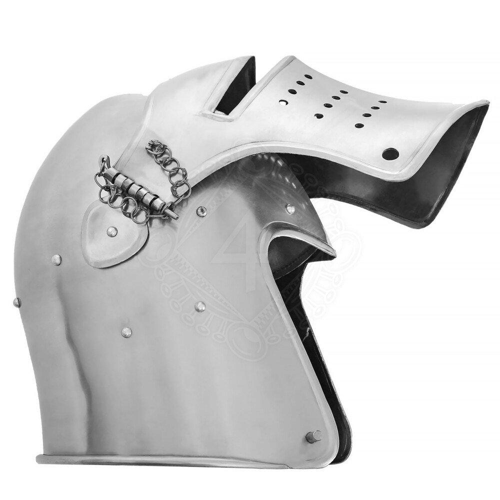 Tento typ přilby je ikonou stoleté války a válek husitských. Design je inspirován dobovými prameny, jako je obraz Spinella Aretina (1407), fresky v italském Spoletu nebo rukopis „La prima deca“ od Tita Livia (cca 1373). V této době se šlap vyvinul v hlavní přilbu rytířů i těžké pěchoty, protože jeho kónický tvar skvěle odrážel údery mečů a seker. Na spodním okraji helmy si jistě všimneš řady malých čepů s otvory. Odborně se jim říká vervelles. Ty slouží k připevnění kroužkového závěsu (aventailu), který historicky chránil krk a ramena. Kroužkový závěs není součástí dodávky, ale helma je na jeho instalaci plně připravena.
