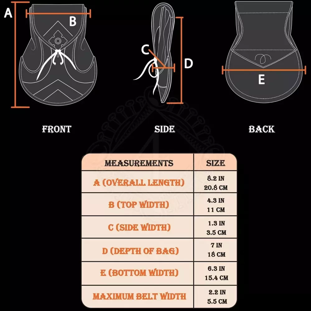 Brašnu snadno navlékneš na jakýkoli opasek až do šířky 5,5 cm díky pevnému koženému poutku na zadní straně. Je to ideální doplněk pro jakoukoli fantasy postavu – nejen pro elfy, ale i pro hraničáře, zloděje, mágy nebo kupce. Je dostatečně prostorná, aby pojala tvé herní mince, amulety, svitky, ale i moderní předměty jako mobilní telefon, klíče a peněženku, které chceš mít na festivalu nebo conu bezpečně u sebe, aniž bys narušil atmosféru kostýmu.