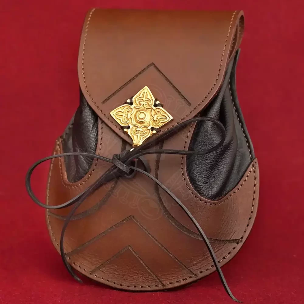 Tato brašna, vyrobená řemeslníky ze společnosti Mythrojan, je navržena s důrazem na detail a odolnost. Přední panel a klopa z pevné hnědé kůže jsou zdobeny reliéfními liniemi, které jí dodávají autentický fantasy vzhled. Tělo brašny je naopak z měkké a poddajné černé kůže, která umožňuje snadný přístup k obsahu. Ústředním prvkem je zdobená mosazná spona, která slouží jako bezpečný uzavírací bod pro koženou šňůrku.