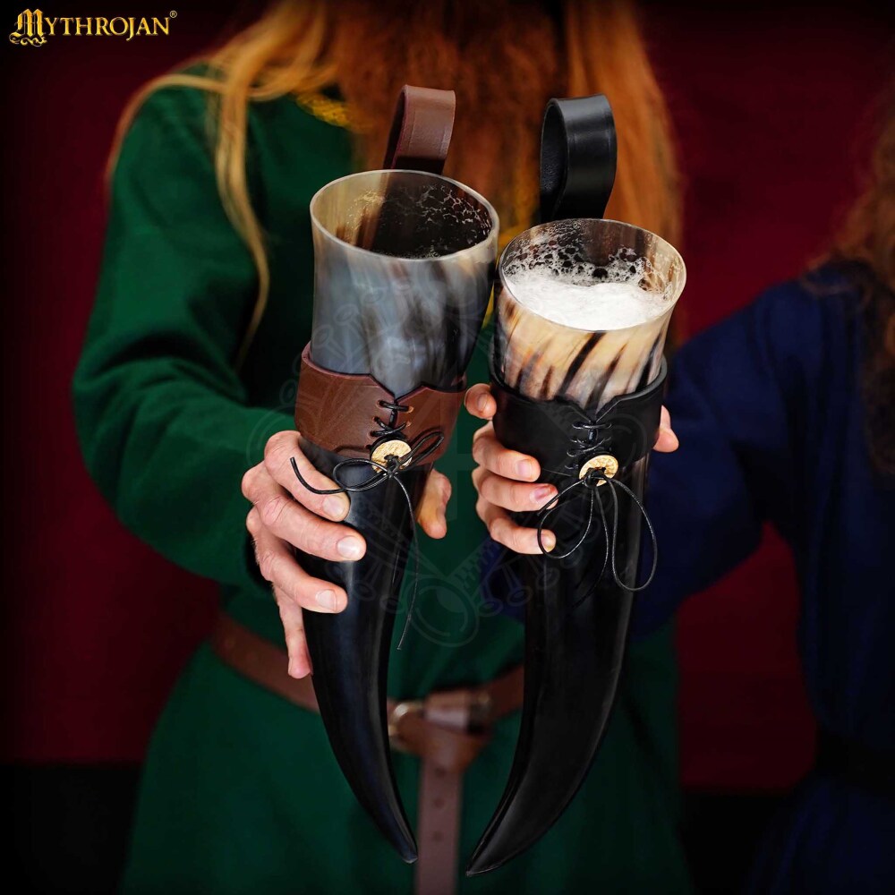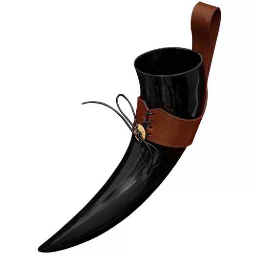 - Praktický kožený držák: Součástí balení je i stylový držák z pravé, hnědé kůže (jak vidíš na fotce, je zdobený šněrováním a kovovým detailem). Díky poutku si ho snadno připevníš na opasek. Už nemusíš řešit, kam s rohem, když zrovna nepiješ – máš volné ruce a svůj roh bezpečně a stylově po boku!