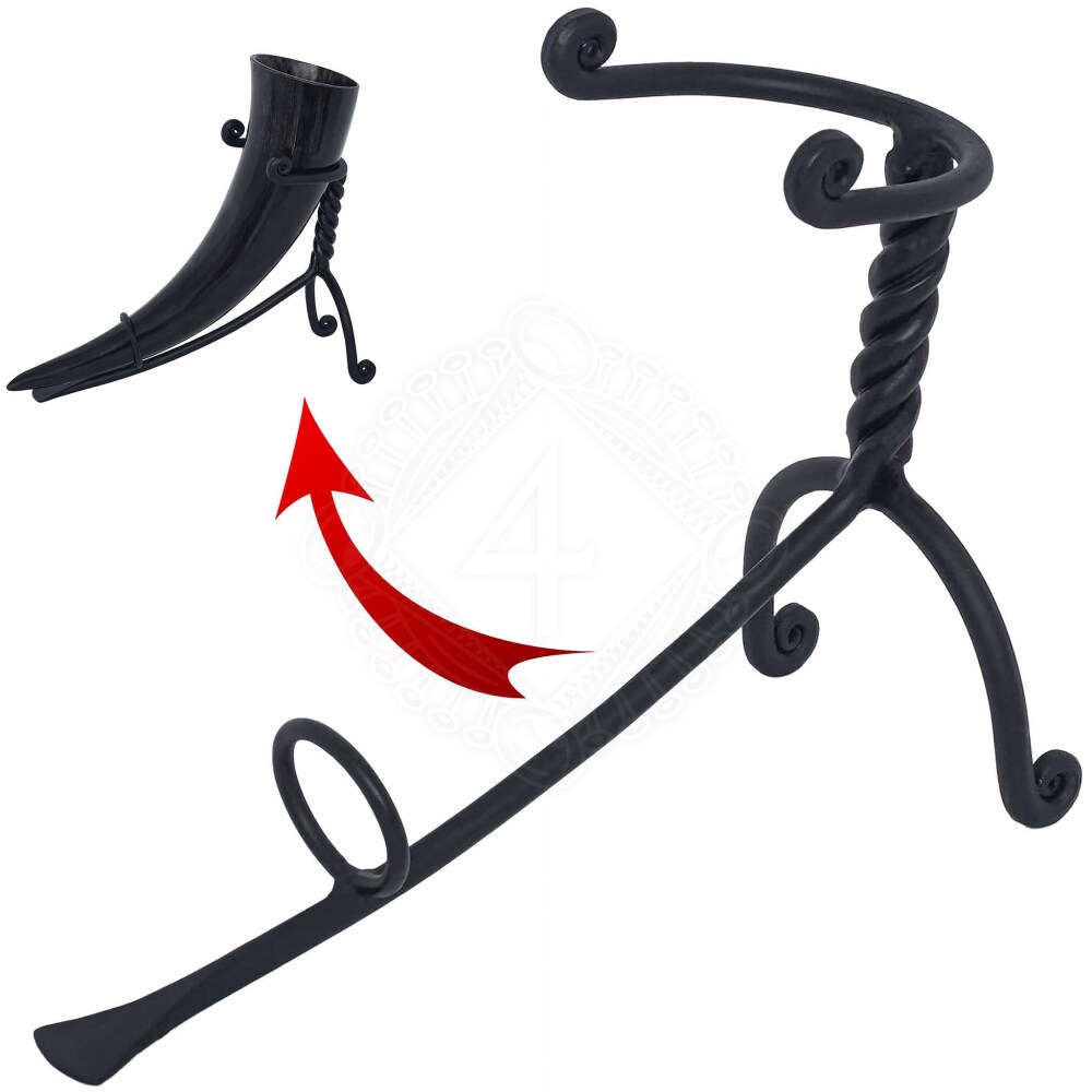 Tento stojan na picí rohy je výsledkem tradičních kovářských technik. Je ručně kovaný z masivní oceli, což mu dodává jedinečný vzhled a robustnost.