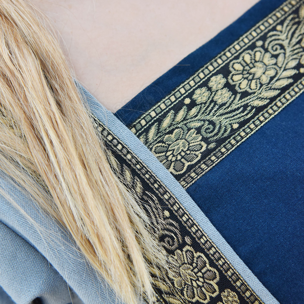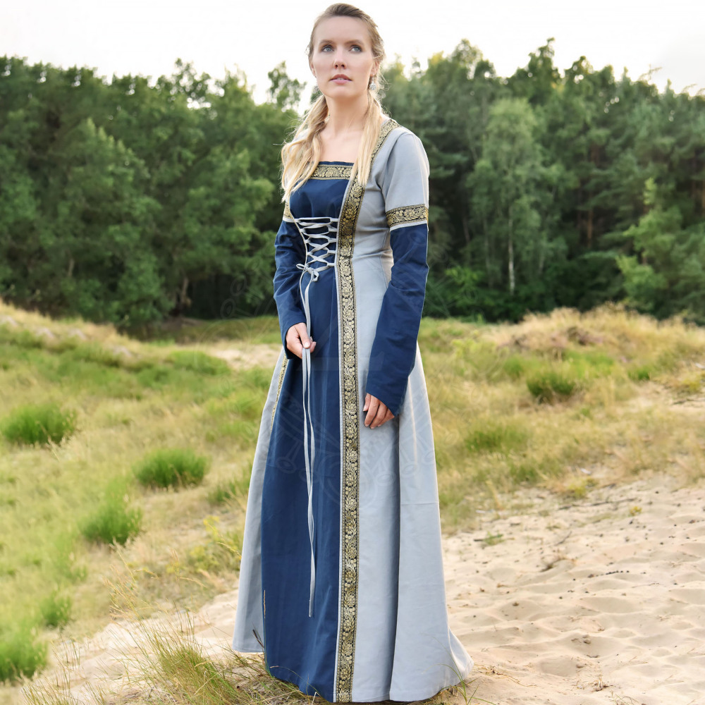 Tyto elegantní středověké šaty mají dvoubarevný vrstvený vzhled a jsou vyrobeny z bavlněné látky. Mají přiléhavý střih a vpředu i vzadu mají navíc šněrování. Pokud dáváš přednost volnějšímu nošení šatů, doporučujeme si objednat o jednu velikost větší. Přiléhavé rukávy se na hřbetu ruky sbíhají do špičky, a proto vypadají velmi elegantně. Více informací k produktu ...