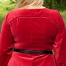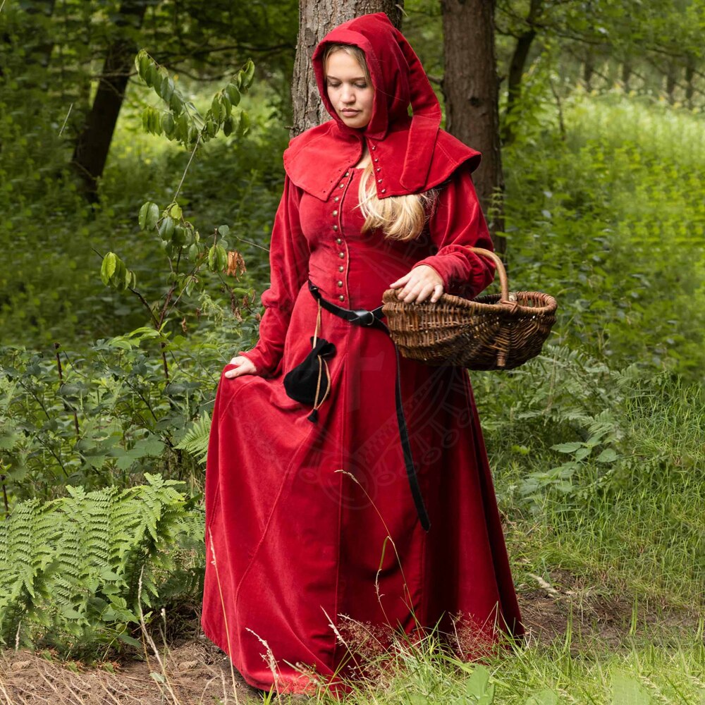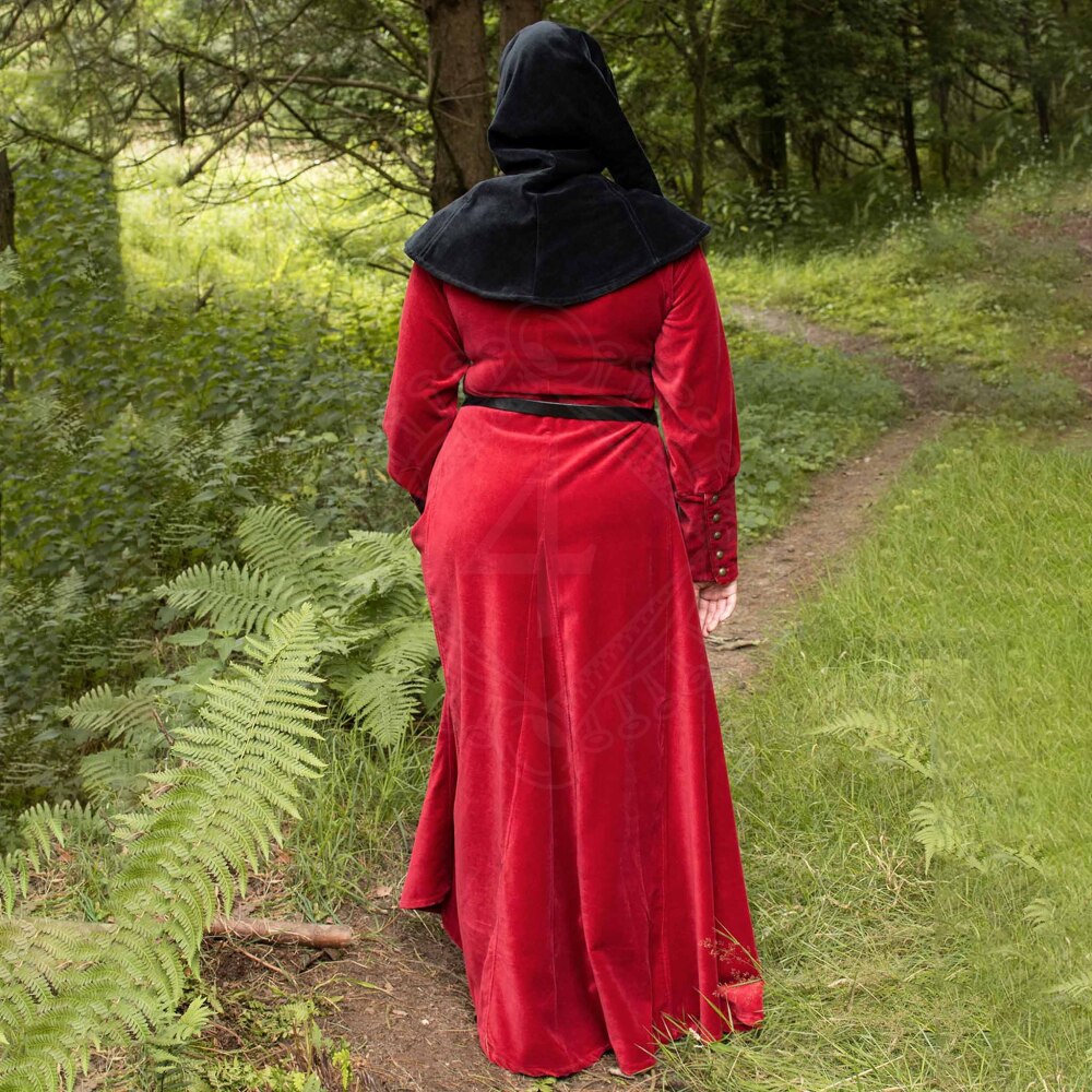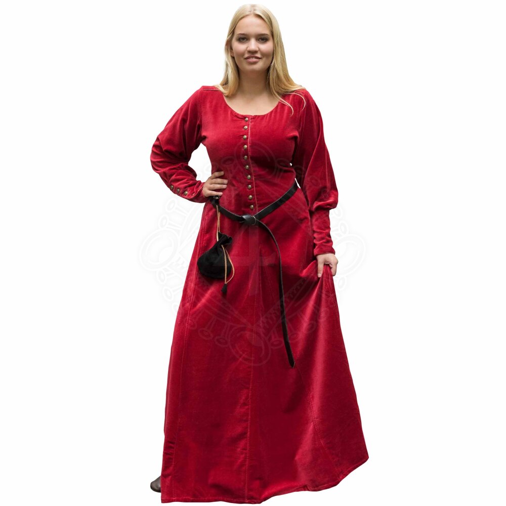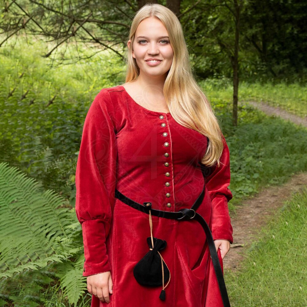 Tyto středověké sametové šaty mají přiléhavý střih a rozšířenou sukni. Takzvané gereny (látkové klíny) vložené do sukně vytvářejí velkorysou šířku lemu, díky které se šaty při chůzi krásně pohupují. Rukávy jsou širokého střihu a jsou zakončeny širokými manžetami se zapínáním na knoflíčky. Výstřih a manžety jsou lemovány saténovou lemovkou a střed předního dílu je zapínaný na četné kovové knoflíky z patinované mosazi. Šaty dlouhé až na zem působí díky těžkému bavlněnému sametu velmi vznešeně a jemné detaily tento vzhled podtrhují.