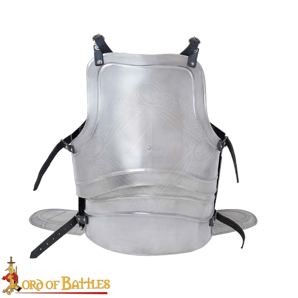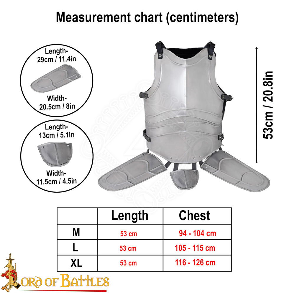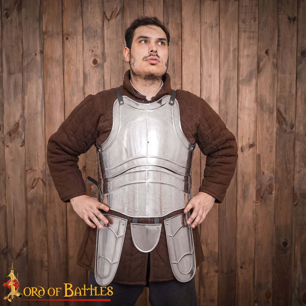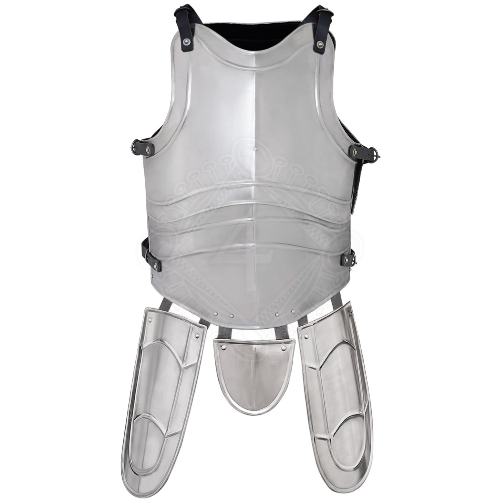 Obleč si toto působivé ocelové brnění a staň se hrdinou svého vlastního fantasy příběhu! Tento kvalitní plátový kyrys s chrániči stehen (tasety) a suspenzorem (šorcem) je navržen tak, aby ti poskytl nejen skvělý vzhled, ale i spolehlivou ochranu při LARPových bitvách, cosplayových akcích nebo na divadelních prknech. Díky své robustní konstrukci a leštěnému povrchu budeš středem pozornosti na každé akci. Více informací k produktu ...