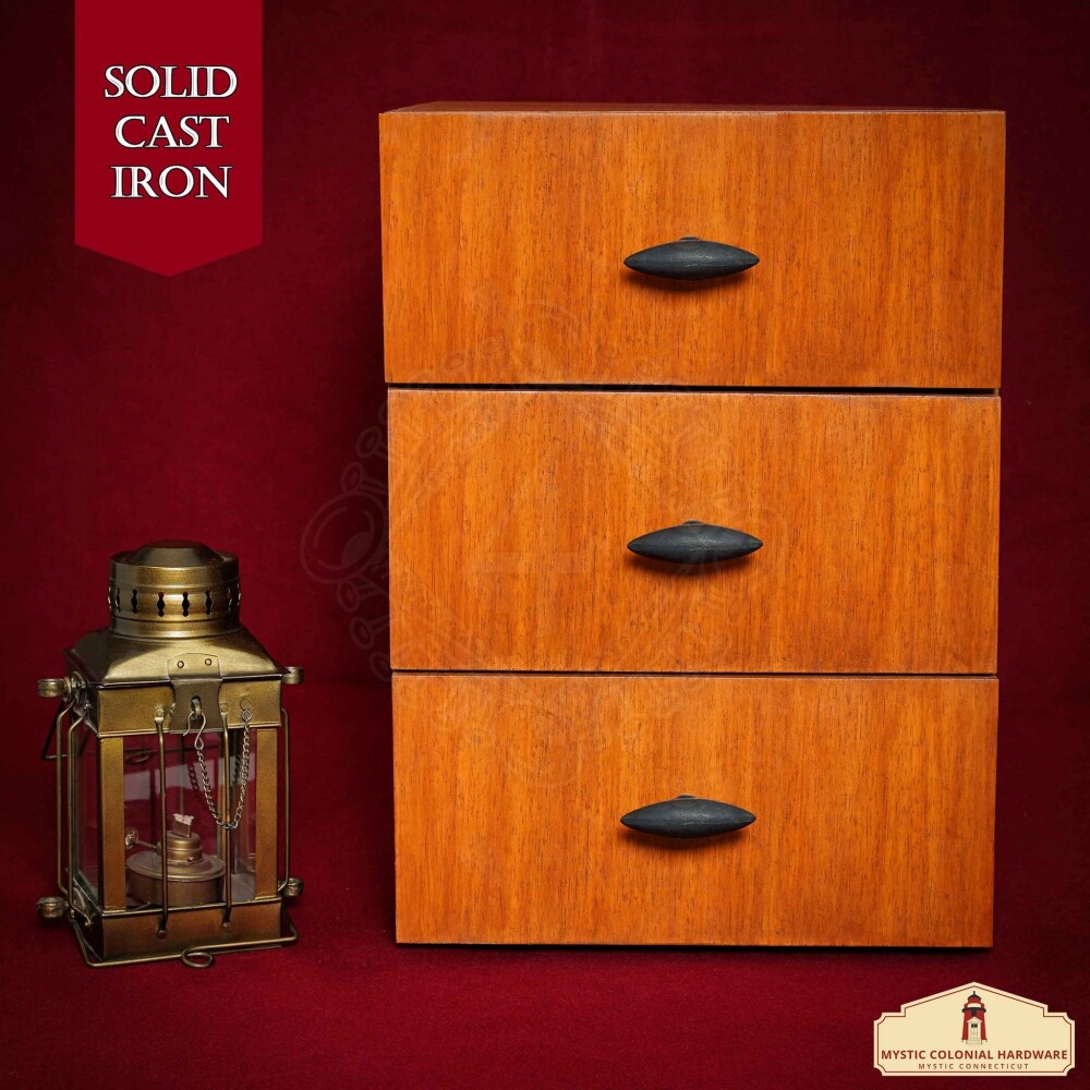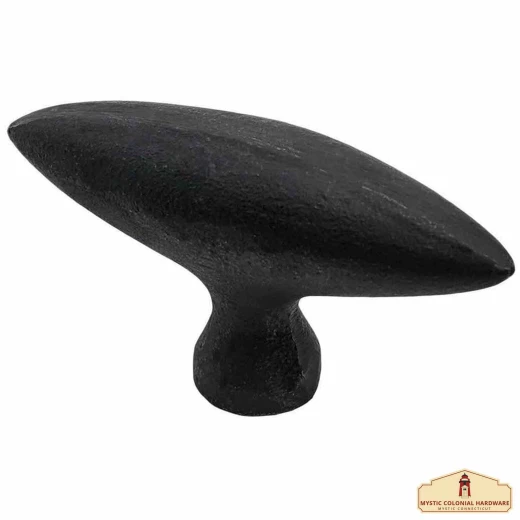 Tato úchytka je vyrobena z masivní litiny tradičními postupy, což zaručuje její pevnost a dlouhou životnost. Charakterizuje ji protáhlý oválný tvar se špičatými konci o celkové délce 8 cm (3,1 palce) a šířce přibližně 2,5 cm. Díky tomuto tvaru se pohodlně a bezpečně drží. Povrch je ošetřen černěním v oleji, které vytváří ochrannou vrstvu s matným, historizujícím vzhledem. Každý kus je díky ruční práci originál. Montážní šroub není součástí dodávky.