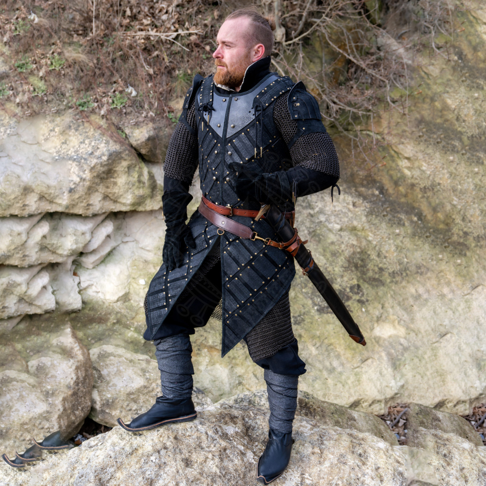 Důležité upozornění: Cena zahrnuje pouze svrchní koženou zbroj "Woodsman". Kroužková zbroj (košile a rukávy), opasek, meč, boty a další doplňky viditelné na fotografiích nejsou součástí dodávky a slouží pouze pro ilustraci.