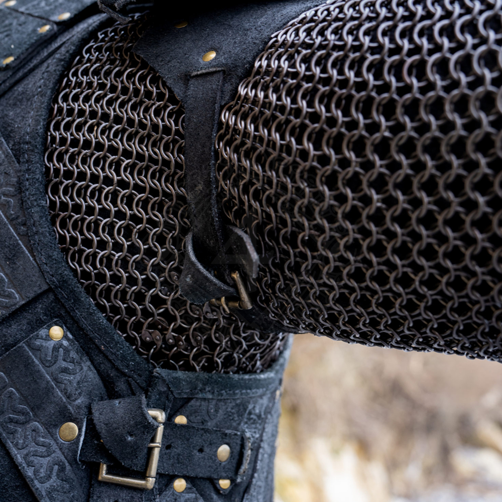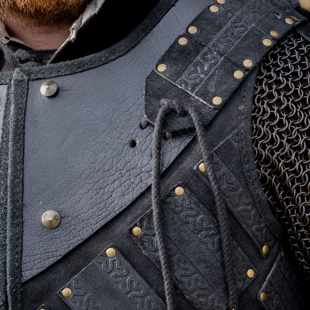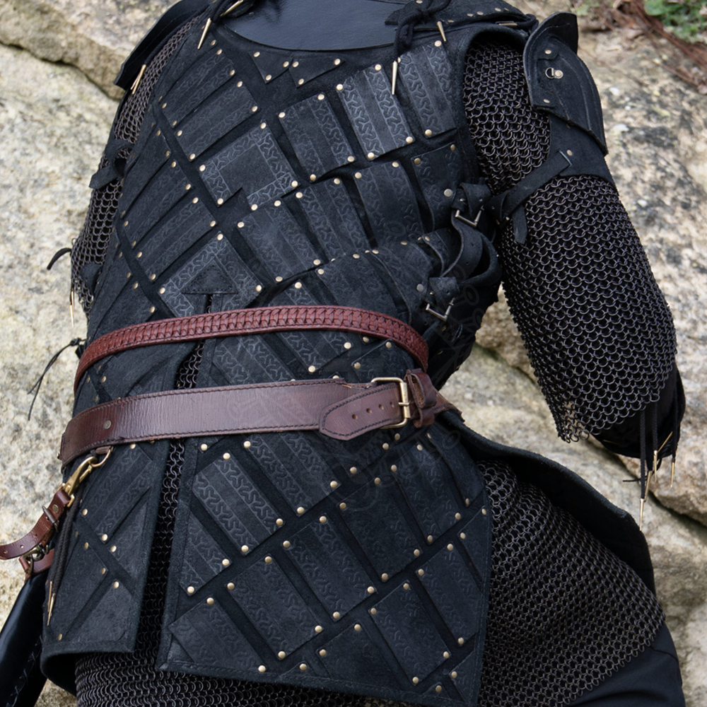Tato černá kožená zbroj je navržena pro maximální efekt a funkčnost na LARP akcích. Její design je volně inspirován brigantinou, typem zbroje, kde jsou ochranné pláty přinýtovány pod svrchní látku nebo kůži. Zde jsou však dekorativní kožené pláty přiznány a tvoří atraktivní diagonální vzor.