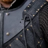 - Přizpůsobení: Zbroj se zapíná pomocí nastavitelných řemenů s mosaznými přezkami na bocích a ramenou. Přední díl lze navíc rozepnout a zapnout řadou mosazných knoflíků.