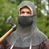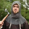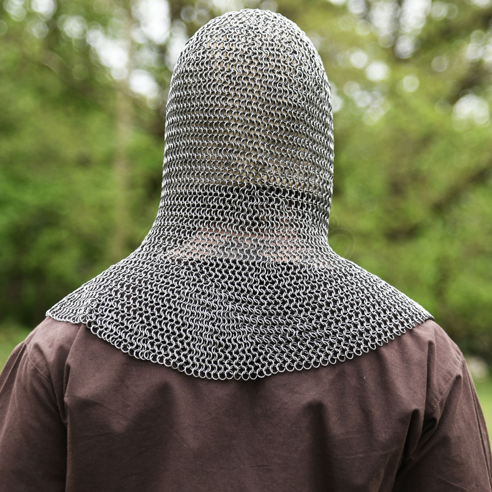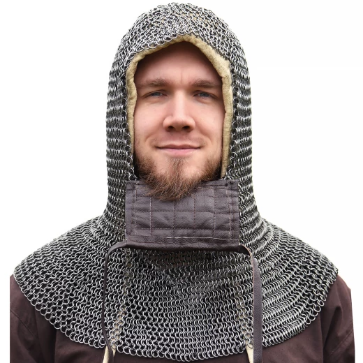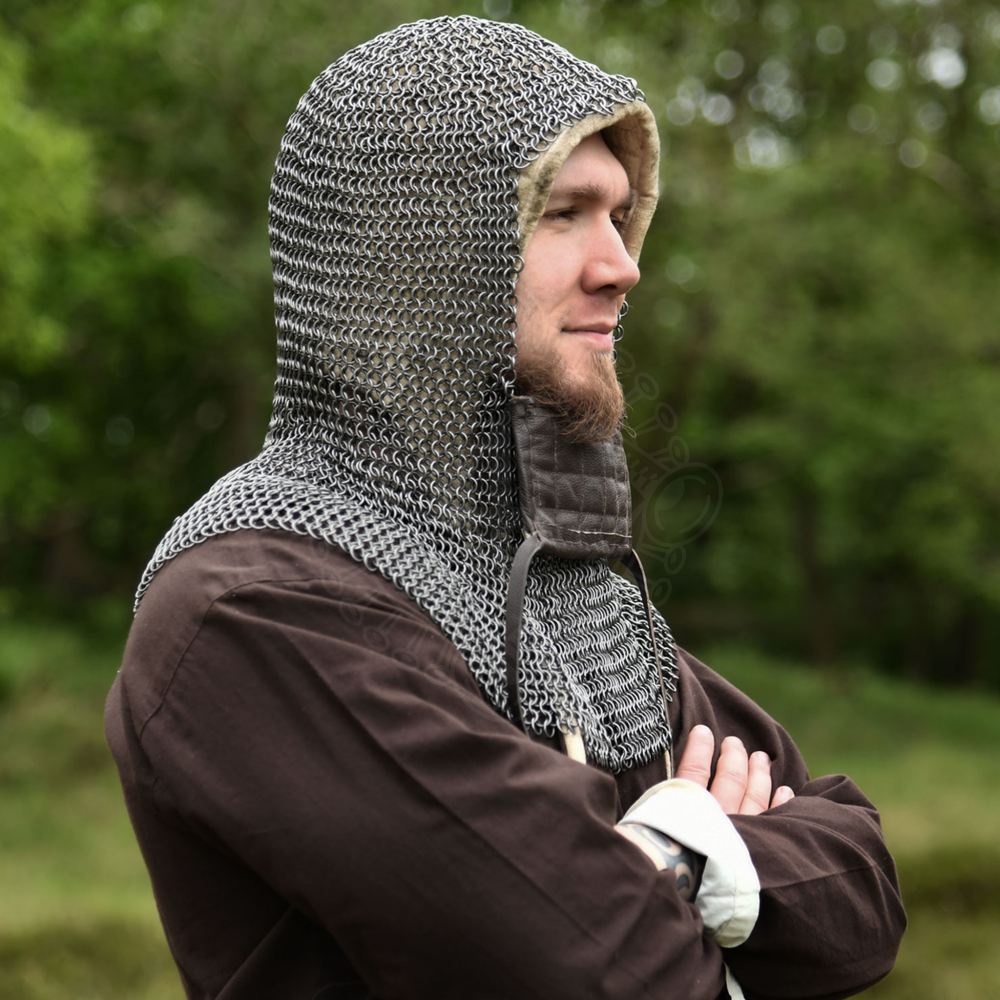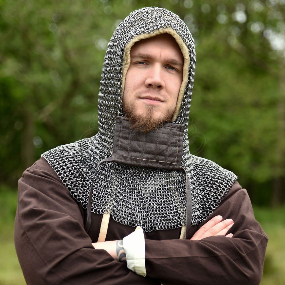 Tato kroužková kukla zcela zakrývá ramena a má autentický čtvercový historický otvor pro obličej. Kukla má také odklopný čtvercový chránič obličeje s koženými lemy přišitými po stranách. Chránič obličeje je z vnitřní strany lehce polstrovaný a lemovaný kůží. Tento typ kroužkové kukly byl oblíbený zejména ve vrcholném středověku (např. u Normanů a křižáků). Pod kroužkovou kuklu doporučujeme nosit látkovou kuklu nebo batvat. Více informací k produktu ...