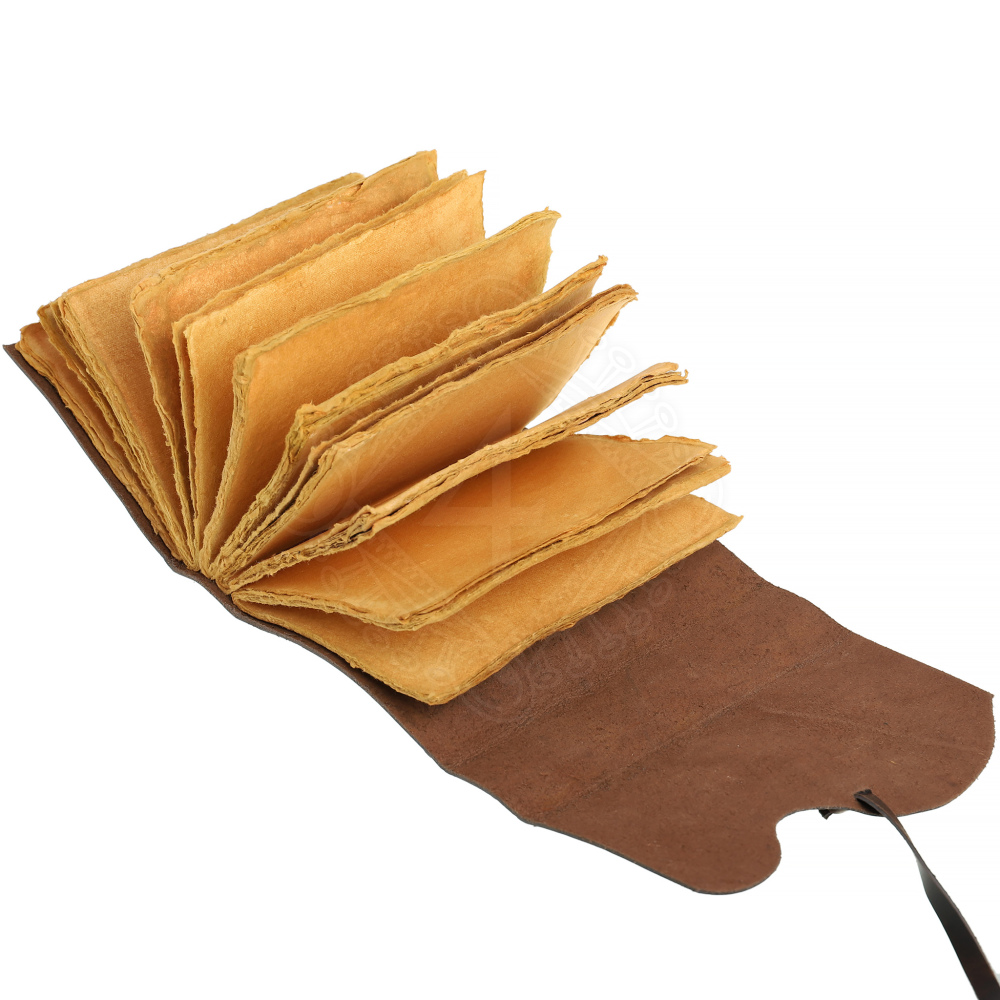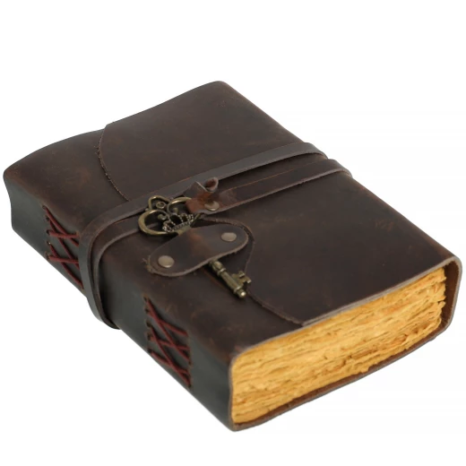 - Autentický vzhled: Zápisník je vytvořen z kvalitní tmavě hnědé bovolí kůže, která je záměrně upravena tak, aby působila opotřebovaně a starobyle. Textura kůže je výrazná a na dotek příjemná, což umocňuje pocit ruční výroby.