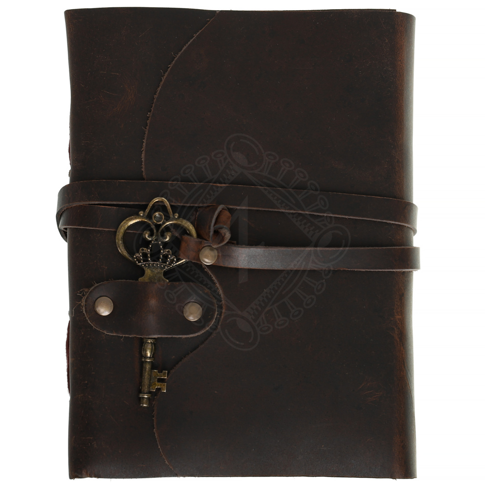 - Praktický uzávěr: Zápisník je obepnutý tenkým koženým páskem, který slouží k jeho bezpečnému uzavření. Pásek se provléká poutkem a na svém konci nese ozdobnou sponu ve tvaru starožitného klíče.
