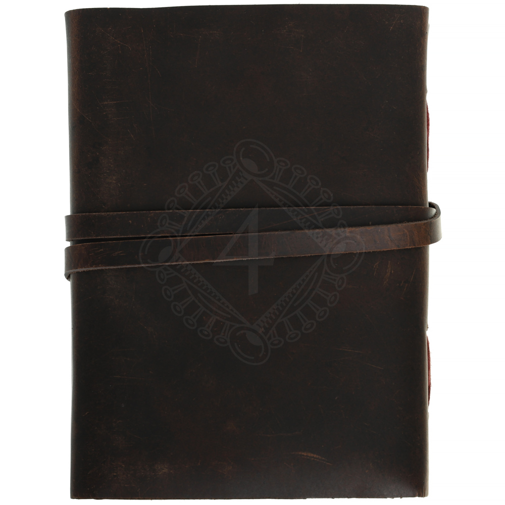 - Ruční vazba: Hřbet zápisníku je zdobený výraznou ruční vazbou. Silné, tmavě červené (až vínové) nitě se kříží přes kožený hřbet a vytvářejí dekorativní prvek, který podtrhuje autentický vzhled zápisníku.