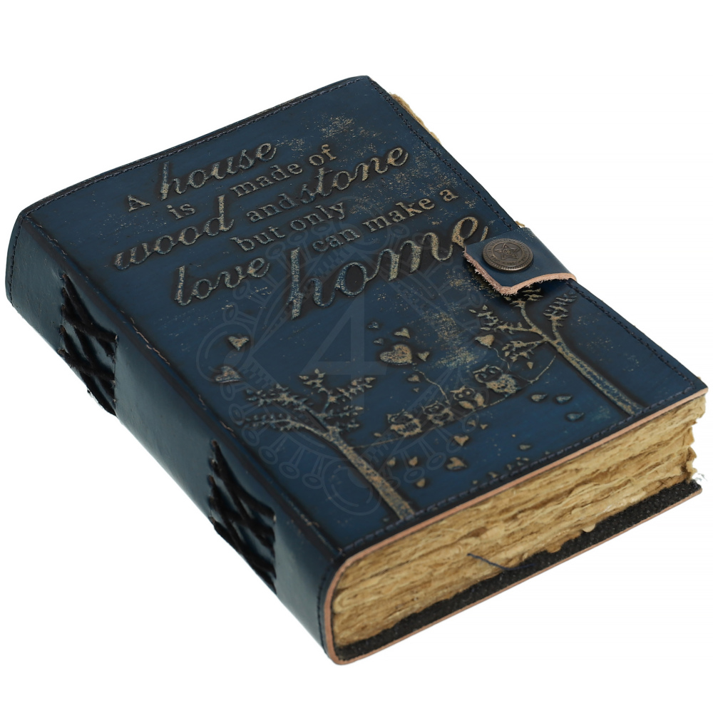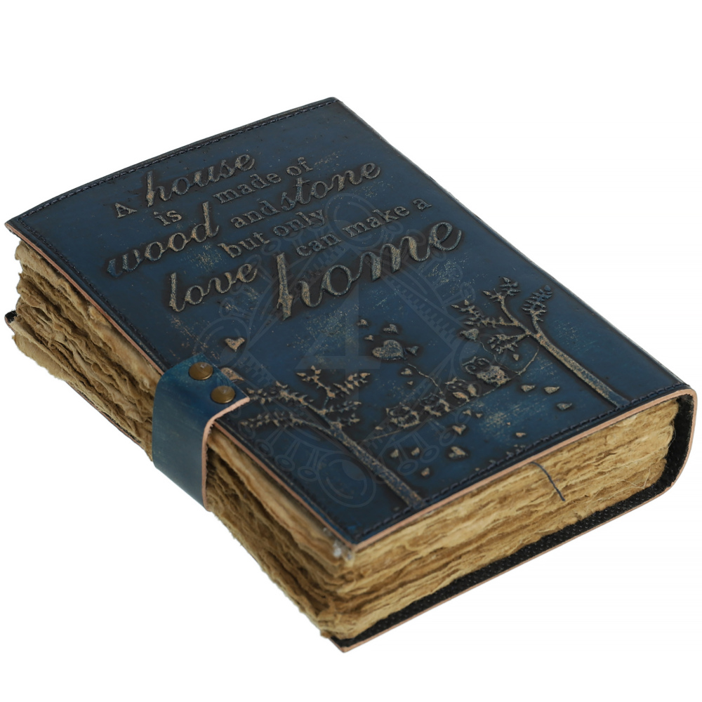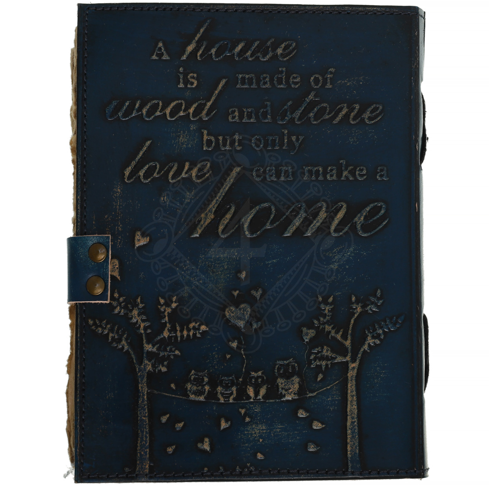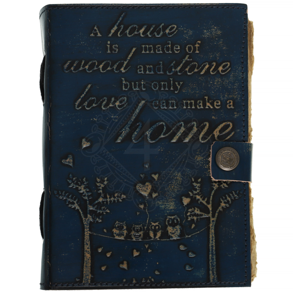 Přední stranu zdobí hluboce vyražený citát, který je ústředním motivem celého zápisníku: "A house is made of wood and stone, but only love can make a home" (Dům je postaven ze dřeva a kamene, ale jen láska z něj udělá domov). Toto poselství zdůrazňuje, že skutečný domov tvoří láska, nikoli jen fyzické zdi.