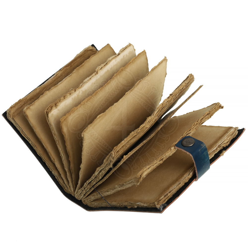 Tento zápisník působí jako starobylý artefakt, který skrývá nejedno tajemství. Jeho tmavě modré kožené desky mají texturovaný povrch a rustikální vzhled. Uvnitř najdeš listy ze zažloutlého papíru, které imitují starožitný papír a dodávají zápisníku nádech nostalgie. Záměrně nedokonalé okraje papíru podtrhují jeho ruční výrobu a jedinečnost. Zápisník se bezpečně uzavírá na kožený pásek s kovovým patentním knoflíkem.