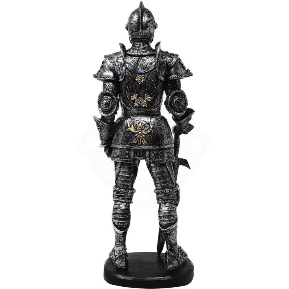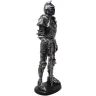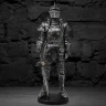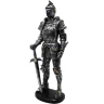 Soška rytíře v plné plátové zbroji s mečem, povrch stříbřitá patina