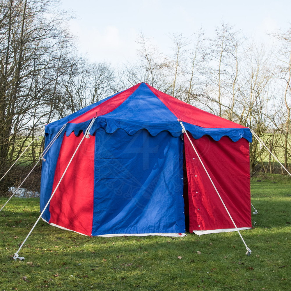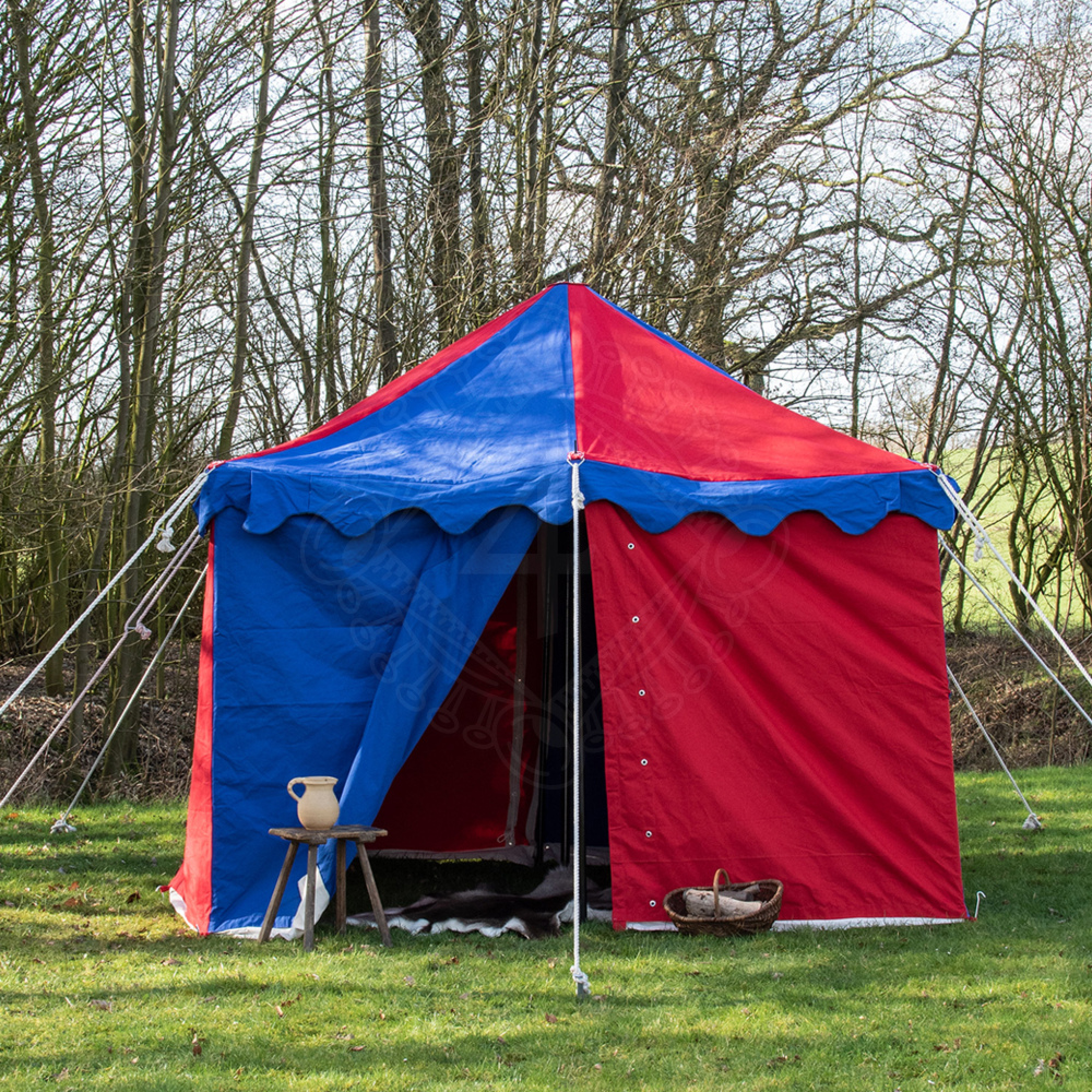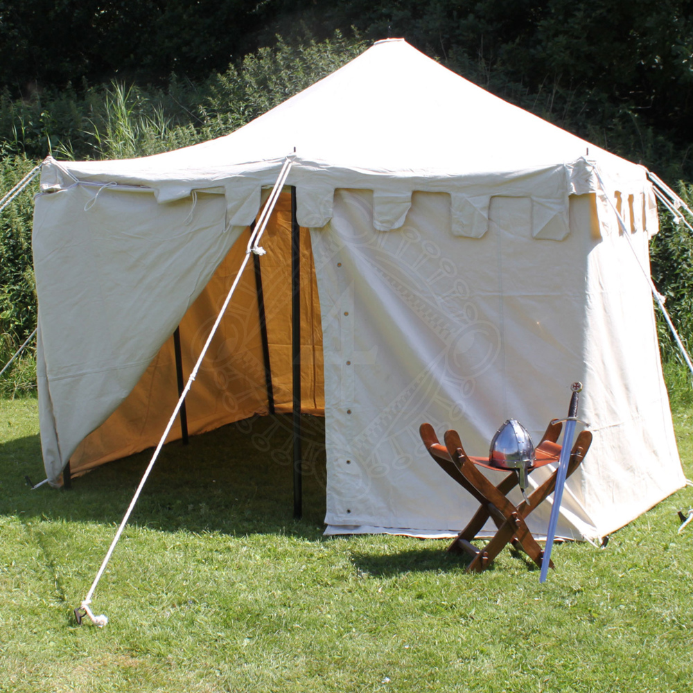 S jednoduchým středověkým stanem Herold získáte cenově dostupný, ale prostorný a funkční stan pro vojenské tábory, středověké trhy nebo LARP. Nabízí dostatek prostoru pro 3 osoby plus zavazadla a vybavení a s výškou po stranách cca 1,80 m a výškou uprostřed cca 2,60 m nabízí dostatek místa nad hlavou i pro vyšší bojovníky. Rytířský stan je po celém obvodu zdoben hradbičkami. Na spodním okraji je připevněna ochrana proti větru a nečistotám. Středověký stan lze otevřít zepředu i zezadu díky dvěma děleným bočním stěnám. Bez bočních stěn lze stan použít jako baldachýn. Aby byl stan kompaktní, není vybaven pergolovým přístřeškem. Více informací k produktu ...