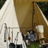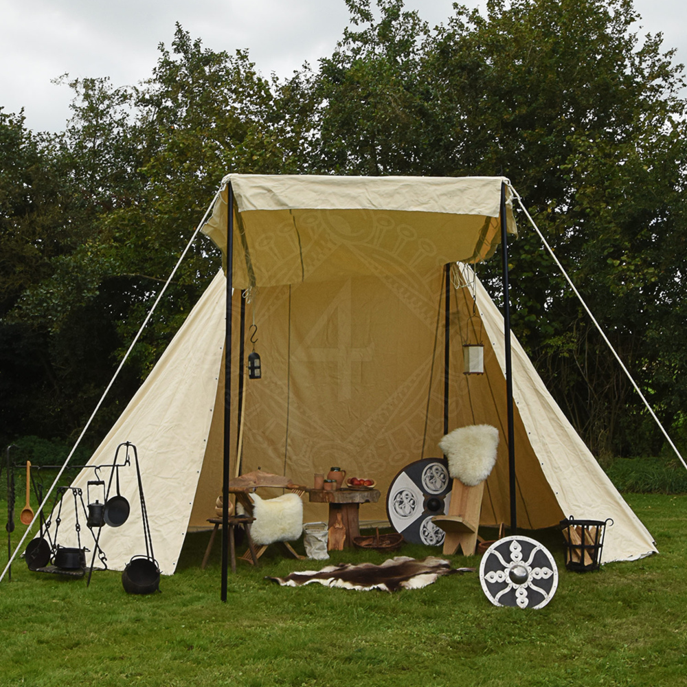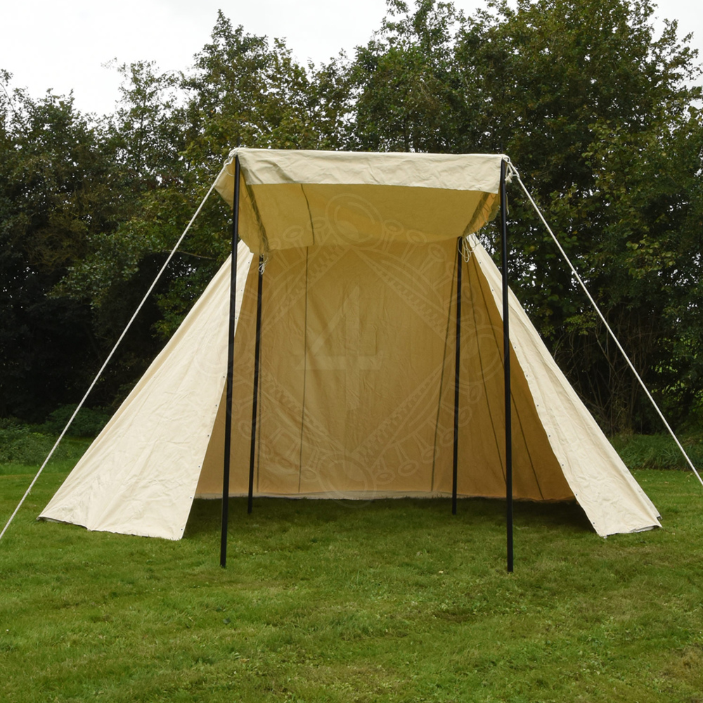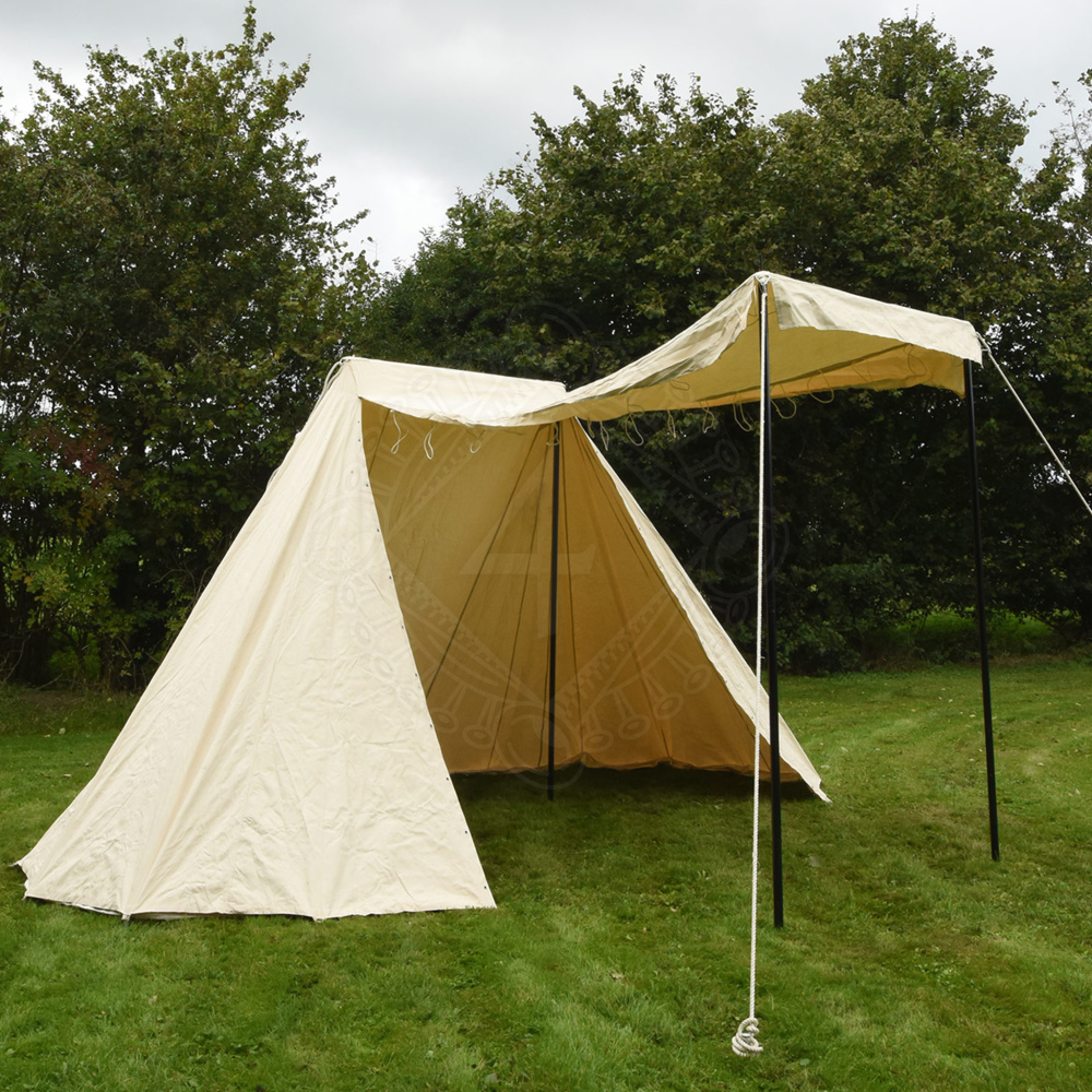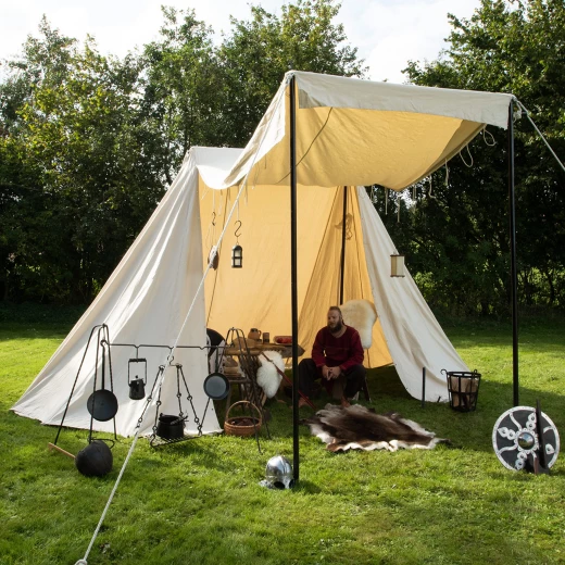 Tento robustní saský kupecký stan nabízí díky svým velkorysým rozměrům dostatek prostoru pro 3 osoby a jejich zavazadla. To znamená, že každý obchodník, kejklíř, žonglér nebo kuchař může nabízet své zboží k prodeji, uložit své věci a dokonce poskytnout přístřeší pro sluhu a jeho ženu. Vnitřní výška je přibližně 3 metry, což je dostatek pro chození vysokých statných mužů ve vzpřímené poloze. Díky otevření celé jedné strany není před zákazníkem nic skryto a je chráněn před sluncem a deštěm pod stříškou. Snadno a rychle jej postaví 2-3 osoby. Více informací k produktu ...
