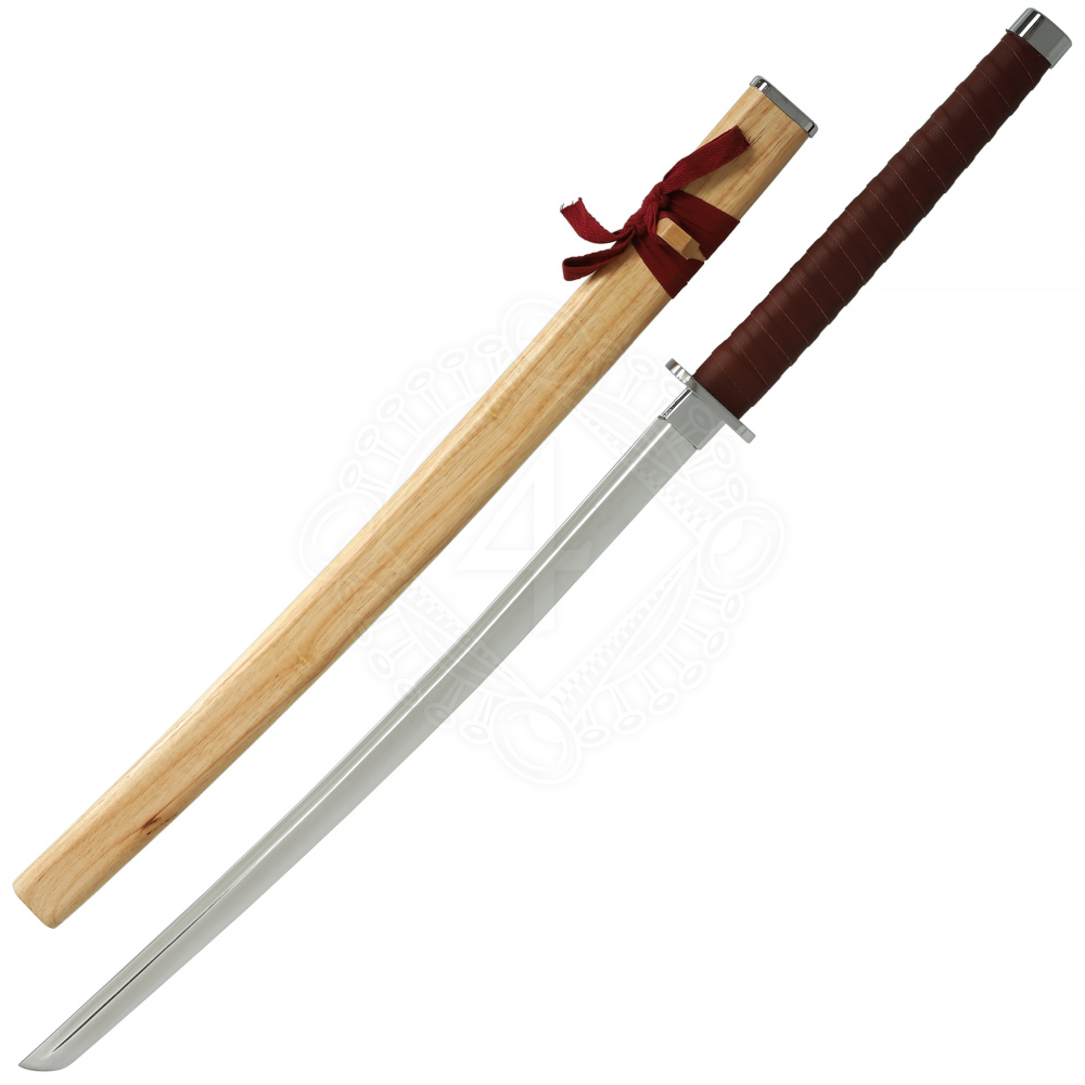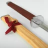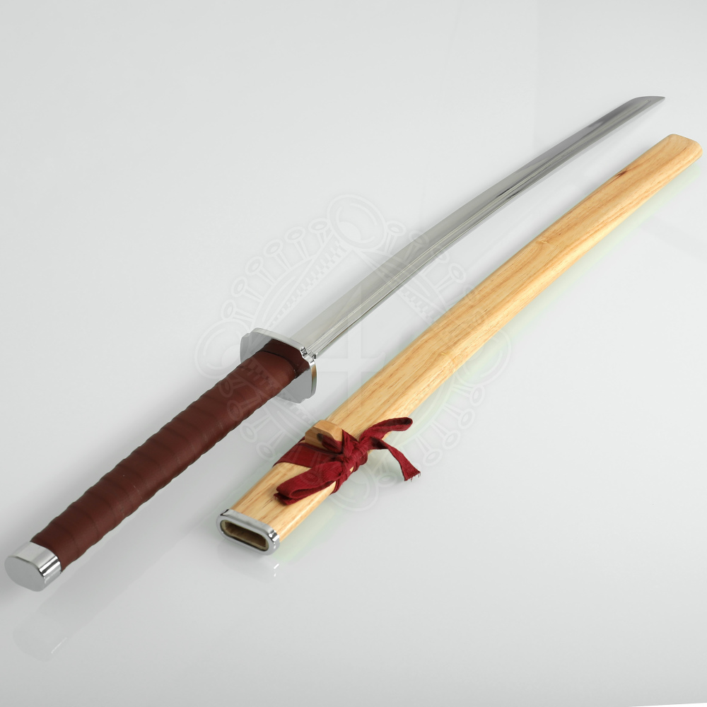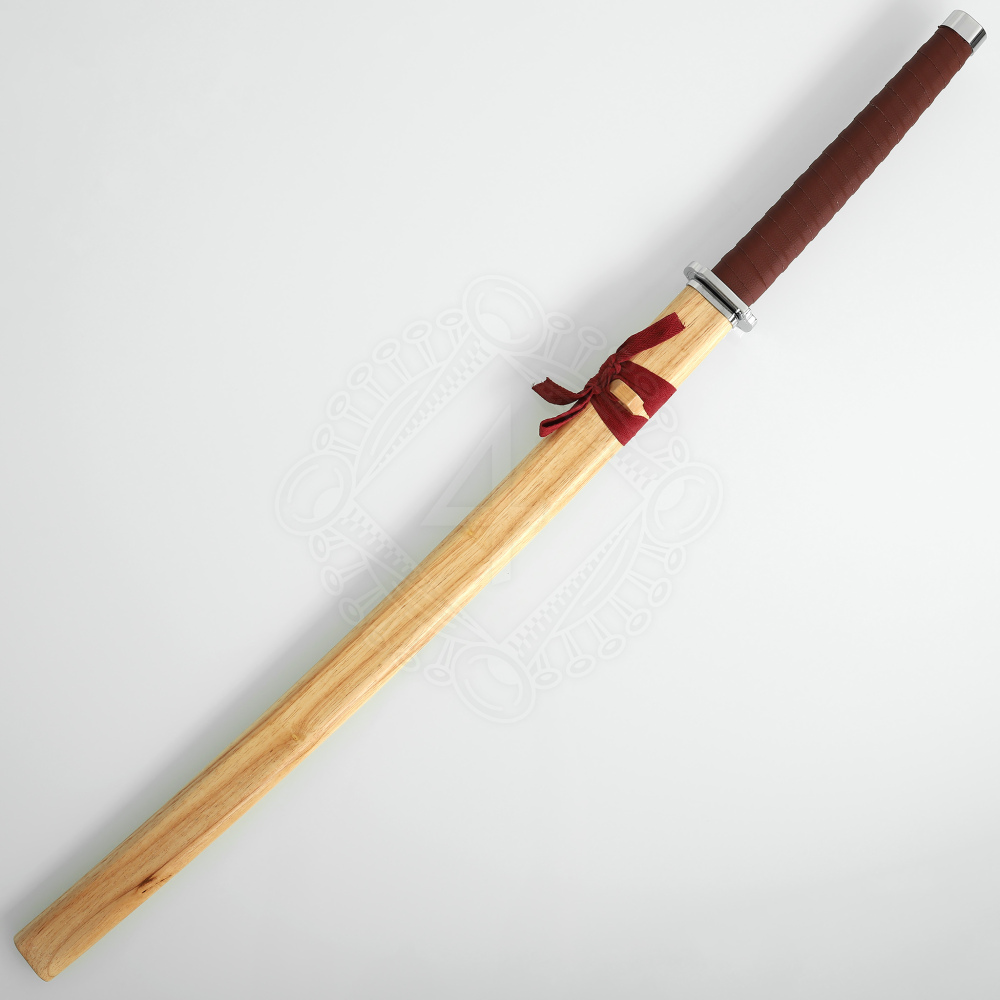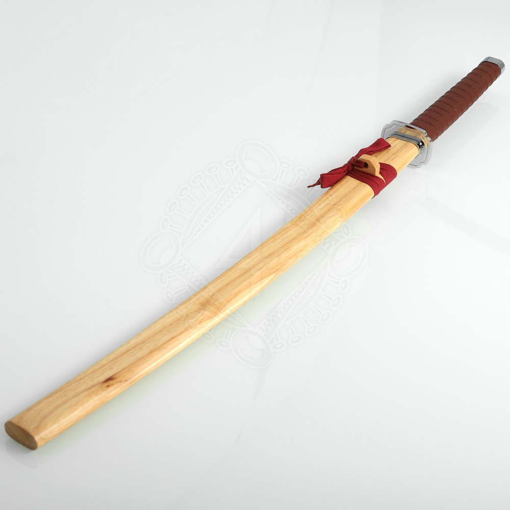 Součástí dodávky je dřevěná pochva (saya) v přírodní barvě světlého dřeva. Její minimalistický vzhled odkazuje na tradiční japonské schránky shirasaya. Pochva je elegantně doplněna vínovou stuhou (sageo) a kovovými prvky pro zpevnění.