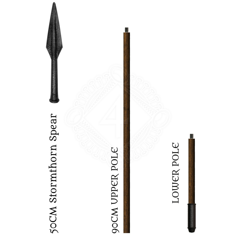 Kopí Stormthorn okamžitě upoutá svým výrazným fantasy designem. Hlavice kopí (50 cm), vyrobená z odolné PUR pěny, má temný, téměř černý vzhled s hrubší texturou. Její tvar připomíná ostře řezaný list nebo trn, což plně odpovídá názvu "Stormthorn" (Bouřný trn) a evokuje spojení s divokou přírodou, bouří nebo trnitými houštinami. Na rozdíl od historických replik se jedná o čistě fantasy design. Ratiště má realistický vzhled tmavého dřeva a spodní část je zakončena kovově vypadající patkou, která slouží jako protizávaží a zlepšuje vyvážení zbraně.
