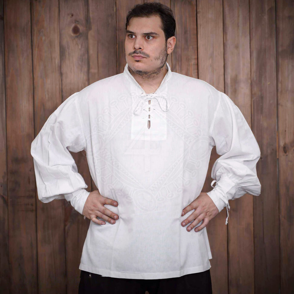 V období renesance a baroka (zejména v 17. století) byla košile primárně spodním prádlem. Měla za úkol chránit drahé svrchní oděvy (kabátce, vesty) před potem a tělo před hrubou vlnou či kůží. Nicméně, v uvolněnějším prostředí – na moři, při šermířských soubojích nebo manuální práci – muži svrchní vrstvy odkládali. Objemné rukávy byly znakem bohatství (více látky = vyšší cena), ale u pirátů a námořníků se staly symbolem praktičnosti a volnosti. Tato replika odpovídá stylu, který by nosili mušketýři, korzáři či dobrodruzi v době Třicetileté války nebo Zlatého věku pirátství.