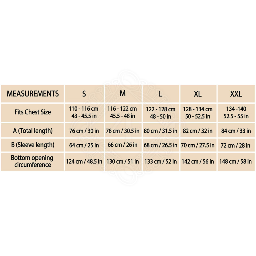 | Velikost | Obvod hrudníku (postava) | Celková délka (A) | Délka rukávu (B) | Obvod spodního lemu |