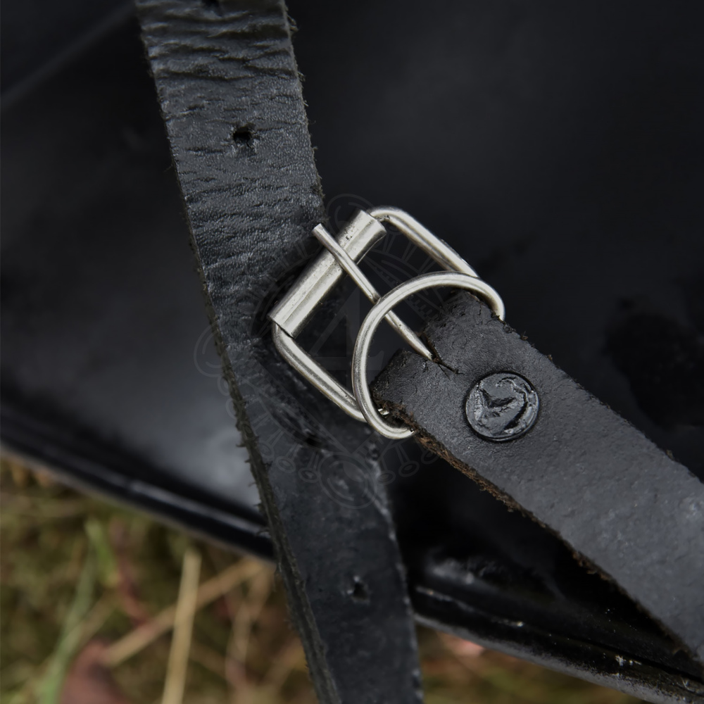 Aby zbroj na noze seděla jako ulitá a nepadala, je vybavena dvojím systémem uchycení: 1. Kožené řemeny: Na zadní straně najdeš tři nastavitelné řemeny z pevné černé kůže (cca 3 mm) s ocelovými přezkami, kterými chránič stáhneš kolem nohy. 2. Šněrování (Nestely): Na horním okraji jsou bavlněné tkanice s mosaznými koncovkami. Ty slouží k přivázání (přišněrování) chrániče k prošívaným nohavicím nebo dubletu. Tento historický způsob uchycení je klíčový – zabraňuje tomu, aby ti zbroj za chůze sjížděla dolů.