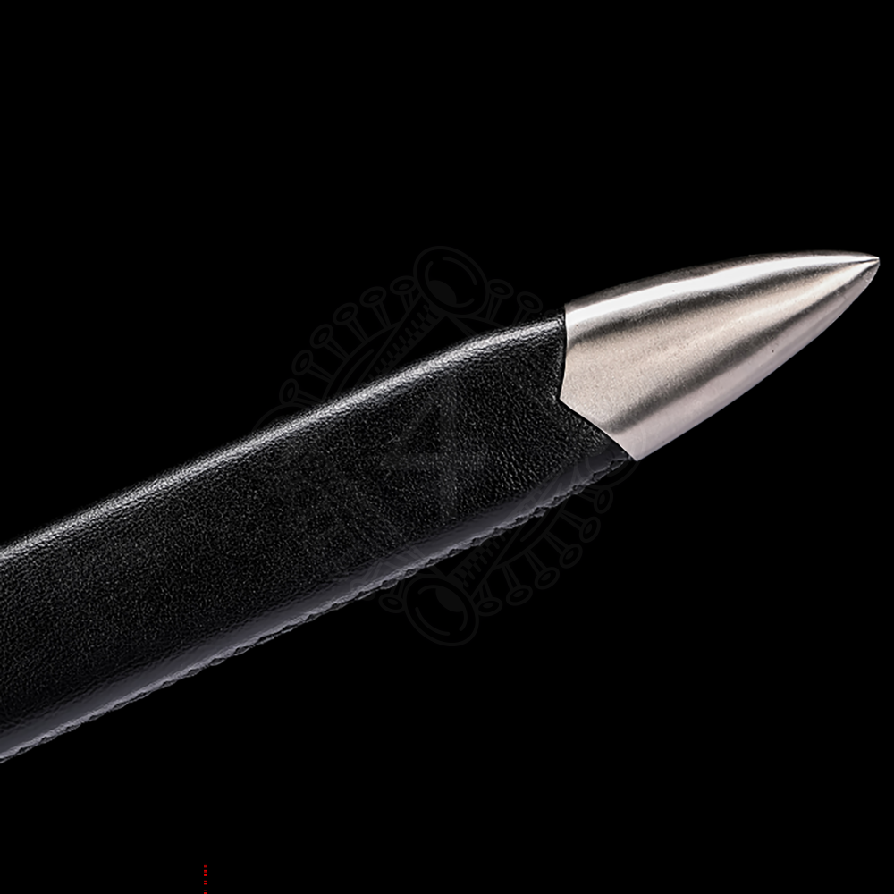 • Kování: Hlavice a záštita jsou vyrobeny z nerezové oceli se saténovou povrchovou úpravou. Hlavice je k řapu čepele roznýtovaná, což je historicky věrný a mechanicky nejpevnější způsob konstrukce.
