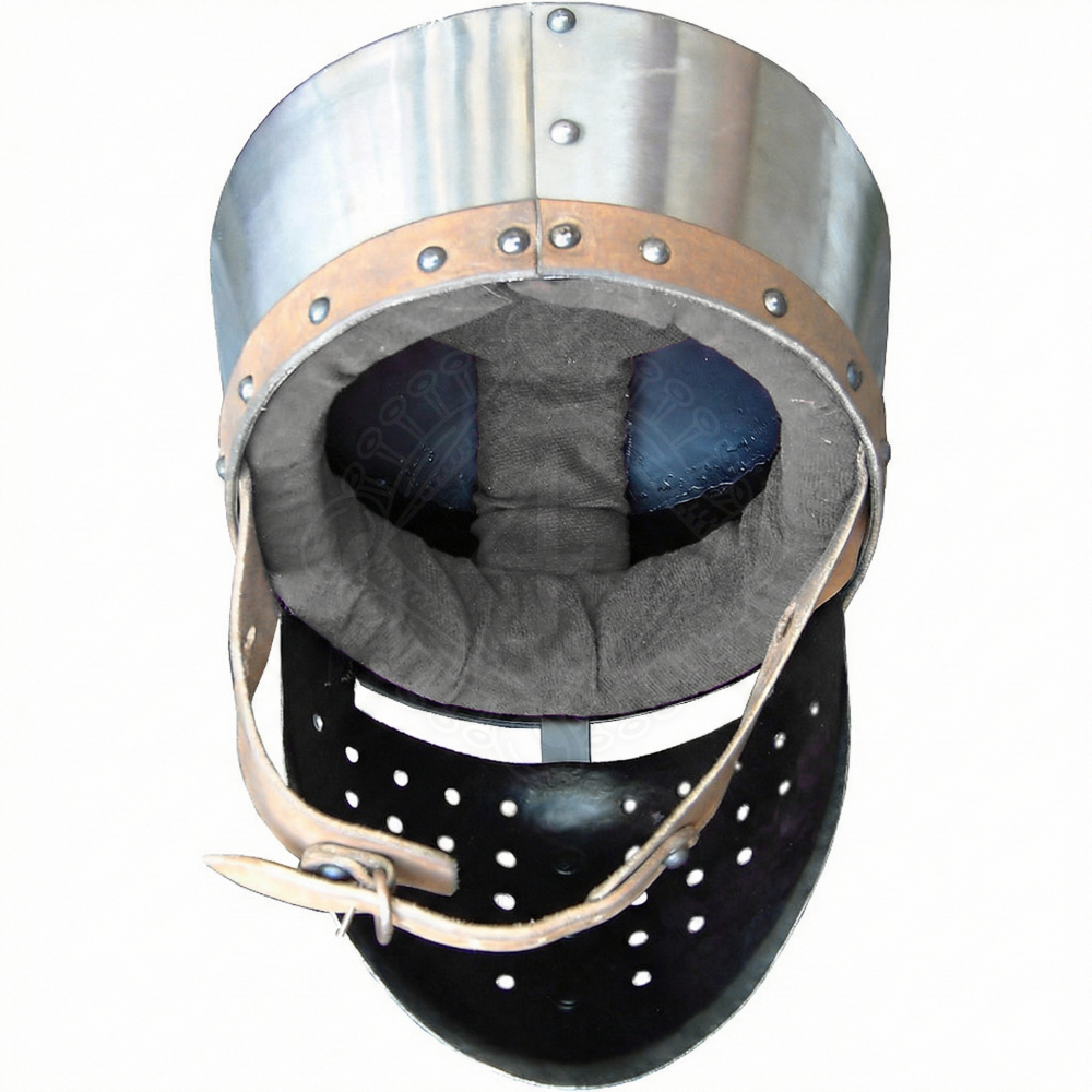 Pro tvůj maximální komfort je přilba vybavena vnitřní látkovou výstelkou (polstrováním) a koženým podbradním řemínkem, díky kterému helma pevně sedí na hlavě i při prudších pohybech. Hledí je opatřeno průzory, které ti zajistí dostatečný přehled o bojišti, a spodní část obličejového štítu je perforována ventilačními otvory pro lepší dýchání. Pokud ti standardní rozměry nesedí, přilba může být vyrobena přesně na míru podle tvých požadavků.