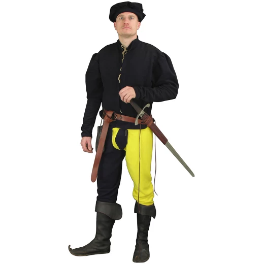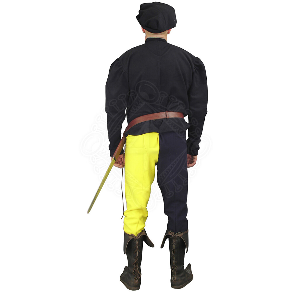 Tento pánský oděv ve stylu pozdní gotiky se skládá z kabátce (dyftýn), kalhot (vlna) a čepce (dyftýn). Kabátec se zavazuje pomocí tkanic. U kalhot umožňuje oblékání rozparek, tzv. krytí. Kalhoty jsou zhotovené v době, kdy se hojně využívalo stylu miparti. Šev na nohavicích je na zadní straně a vede přes zadek, stehno a lýtko. Tento oděv můžeme nabídnout v různých variantách: dvoubarevné, pruhované, s většími šachovnicovými vzory apod. Pozdně gotický pánský oděv doplňuje stylová čepka. Více informací k produktu ...