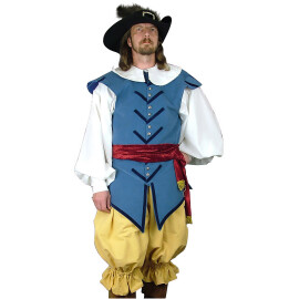 Další raně barokní kostým pro udatné mušketýry je šitý z dyftýnu. Vesta je bez rukávů s prodlouženými šosy, na předním díle se zapínáním na spony. Pod vestu se obléká bavlněná košile se širokými rukávy zakončenými manžetami na šněrování. Široký límec je po obvodu zdobený krajkou. Kalhoty jsou široké v pase stažené do pasového límce. Kostým Mušketýr John doplňuje klobouk zdobený pštrosímy pery a ozdobnou sponou. Více informací k produktu ...