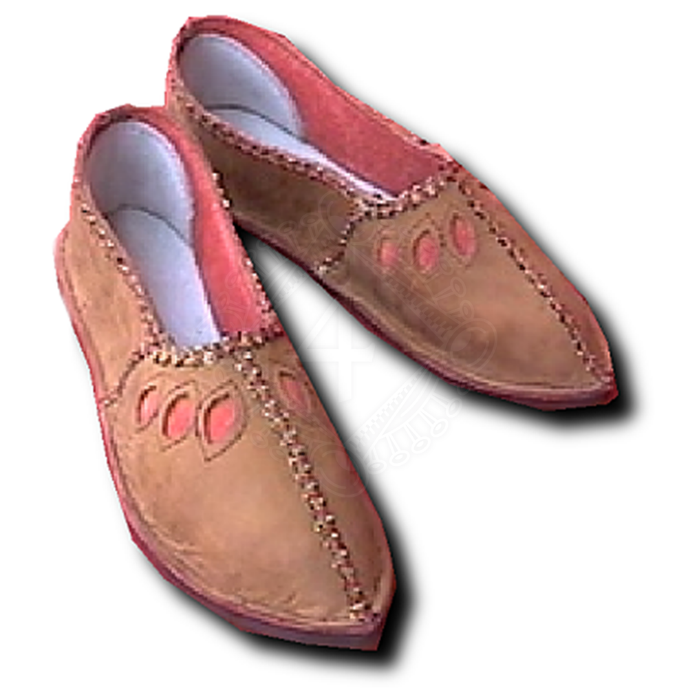 Kontrastní barvy; z 15.-16.stol. Nízké boty renesančního typu jsou zdobené průstřihy, které vyplňuje měkká kůže, a vnějšími švy.