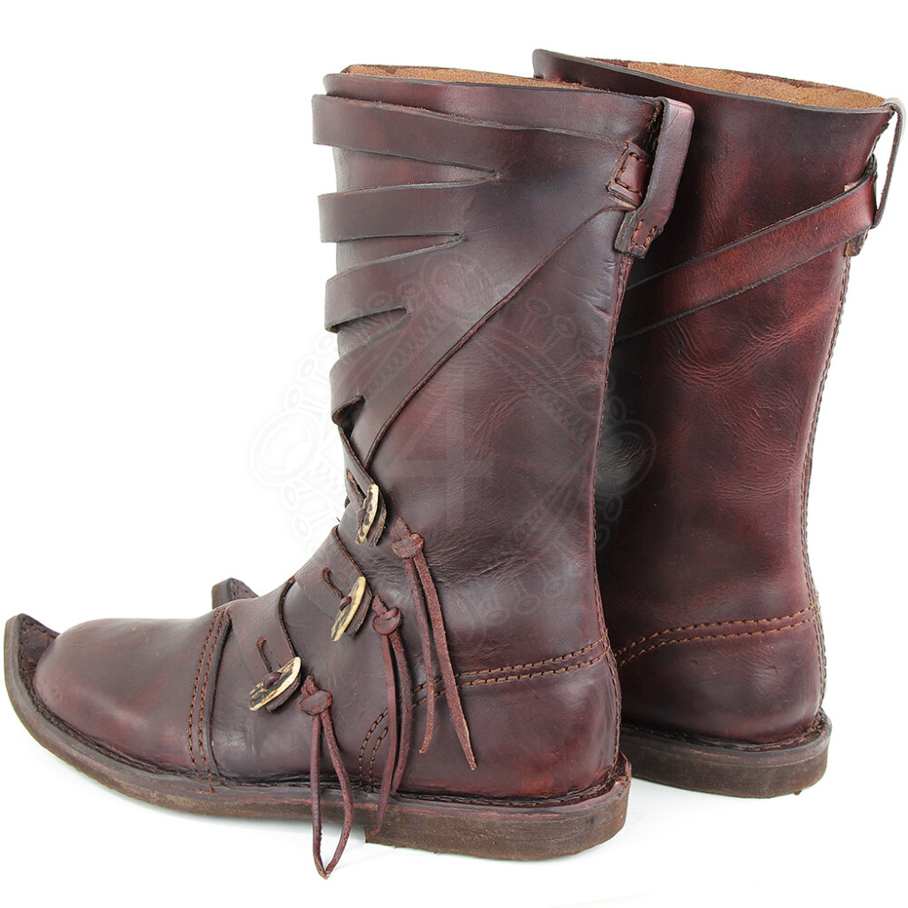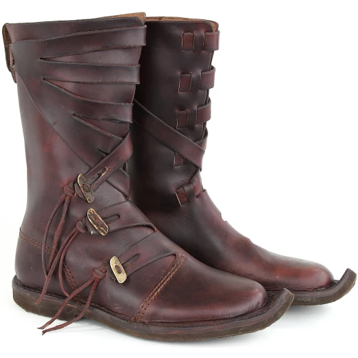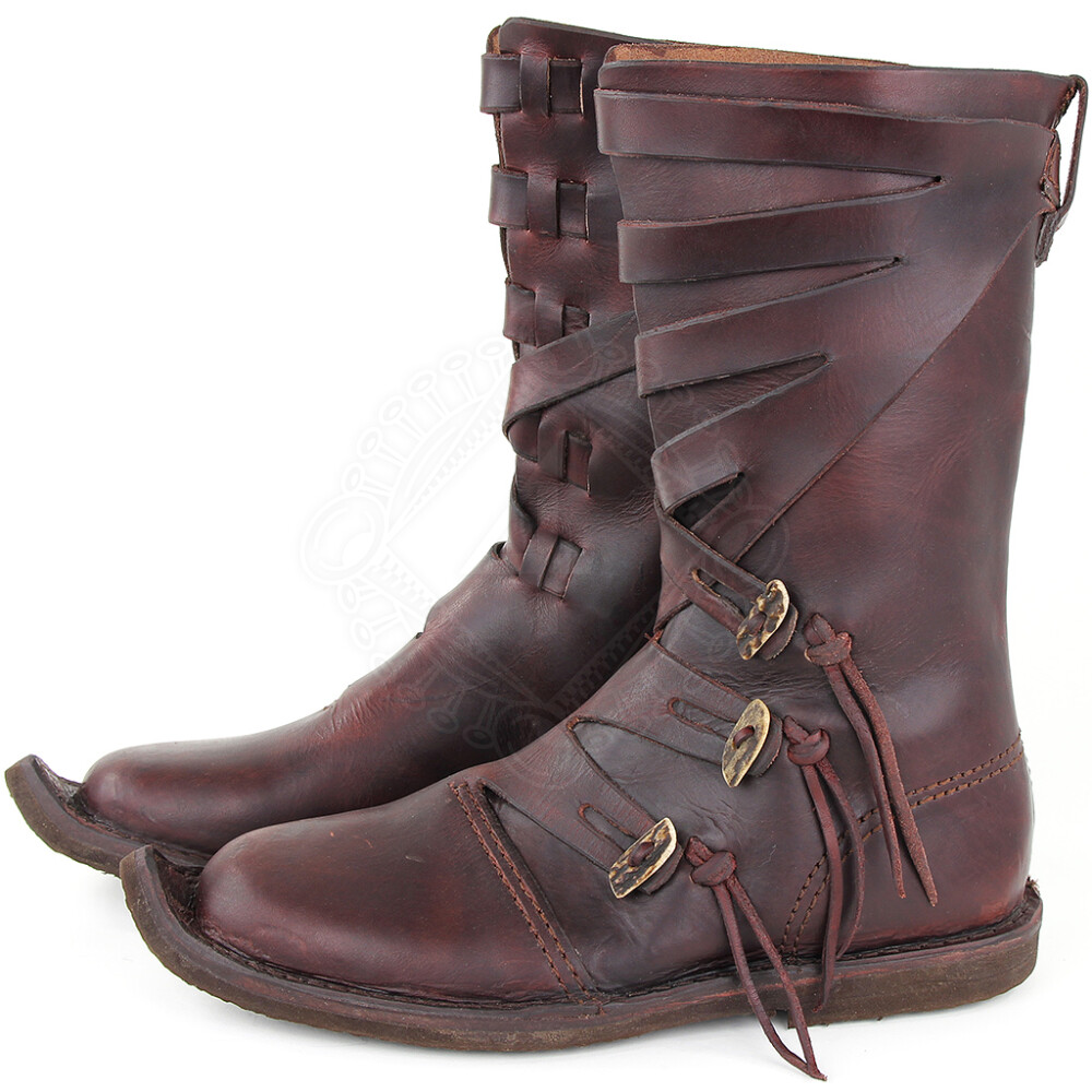 Jeden pár Vikinský vysokých bot Huskarl váží cca 1,25 kg.  Tento model Vikinských boty se vyrábí POUZE o celkové výšce cca 29cm. Kožená obuv sahá nad kotníky a vepředu je výrazně zašpičatělá. Obuv zdobí kožené pásky, které se efektivně uplatňují v systému zapínání na knoflíky. Více informací k produktu ...
