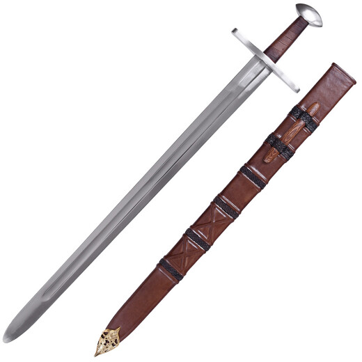 V období vrcholného středvěku začali vikonské meče ztrácet své charakteristické vlastnosti. Široká pomalu se zužující čepel, jakož i trojúhelníková hlavice měnili tvar směrem k dlouhému meči středověku. Tato věrná replika představuje přechodovou fázi ve vývoji meče. Trojúhelníková hlavice se mění na paraořech. Záštita se prodlužuje. Čepel se prodlužuje, prochází až skrz hlavici, na jejímž konci je roznýtovaná. Rukojeť tvoří stopka čepele obložená dřevem a ovinutá kůží. Více informací k produktu ...