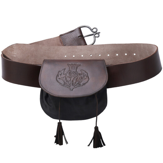 Tato historická brašna se hojně používala v oblastech jižního Skotska. Lépe známá je pod názvem sporran (ze skotské galštiny). Skotský sporran s opaskem a kovanou sponou je vyroben z hovězí usně o síle 2,5-3mm. Na klopně má vyražený bodlák jako symbol národní identity. Více informací k produktu ...