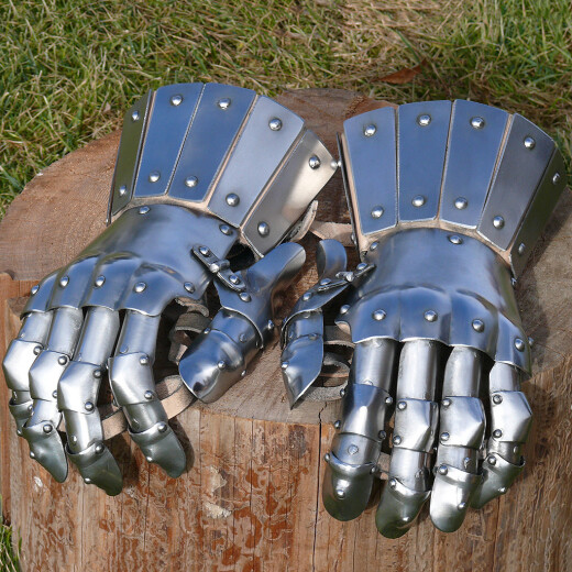 Nošení plátových rukavic na holých rukách je nepohodlné a navíc může dojít k jejich poranění o nýtované spoje a hrany kovových lamel. Proto důrazně doporučujeme ruce chránit (polstrovanými) koženými rukavicemi. Tyto plátové rukavice jsou na vnitřní straně vybaveny řadou oček z kožených řemínků, které jsou určeny pro prostrčení prstů a dlaně kožených rukavic. Kůže je materiál, který se opotřebí nejdříve, proto je tento systém vhodný na snadnou výměnu opotřebených rukavic. Na přání Vám můžeme do rukavic na pevno zabudovat kožené rukavice, které si u nás též objednáte. Své přání prosím poznamenejte do poznámky objednávky. Upozorňujeme ale, že zde se už jedná o zakázkovou úpravu a rukavice nelze vrátit do 14 dnů, jak je to běžné u většiny ostatních výrobků prodávaných na dálku.