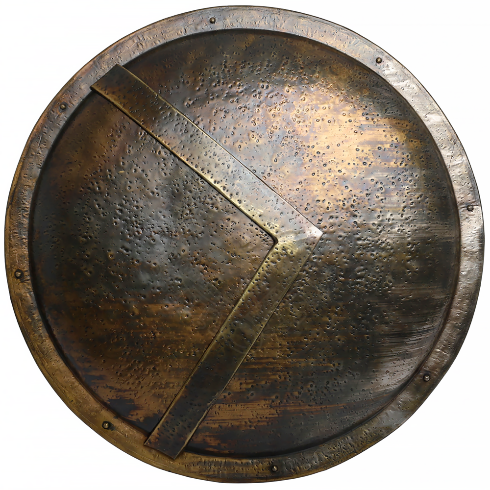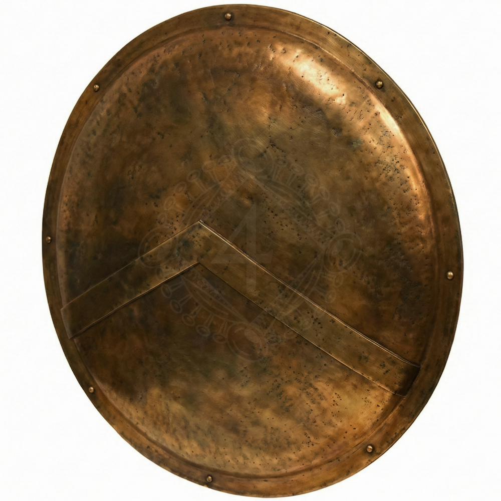 Tento štít je vyroben z oceli a je bohatě plátován starožitnou mosazí, což mu dodává autentický bronzový vzhled. Povrch je záměrně patinován (tzv. battle-worn finish), aby evokoval dojem zbraně prověřené bojem. Dominantním prvkem je reliéfní písmeno Lambda (Λ). Zadní strana štítu je plně polstrovaná a potažená, což zvyšuje komfort při kontaktu s rukou. Úchop je řešen klasickým argivským stylem – ruku provlékneš širokým koženým popruhem (porpax) a dlaní sevřeš pevné madlo u okraje (antilabe).