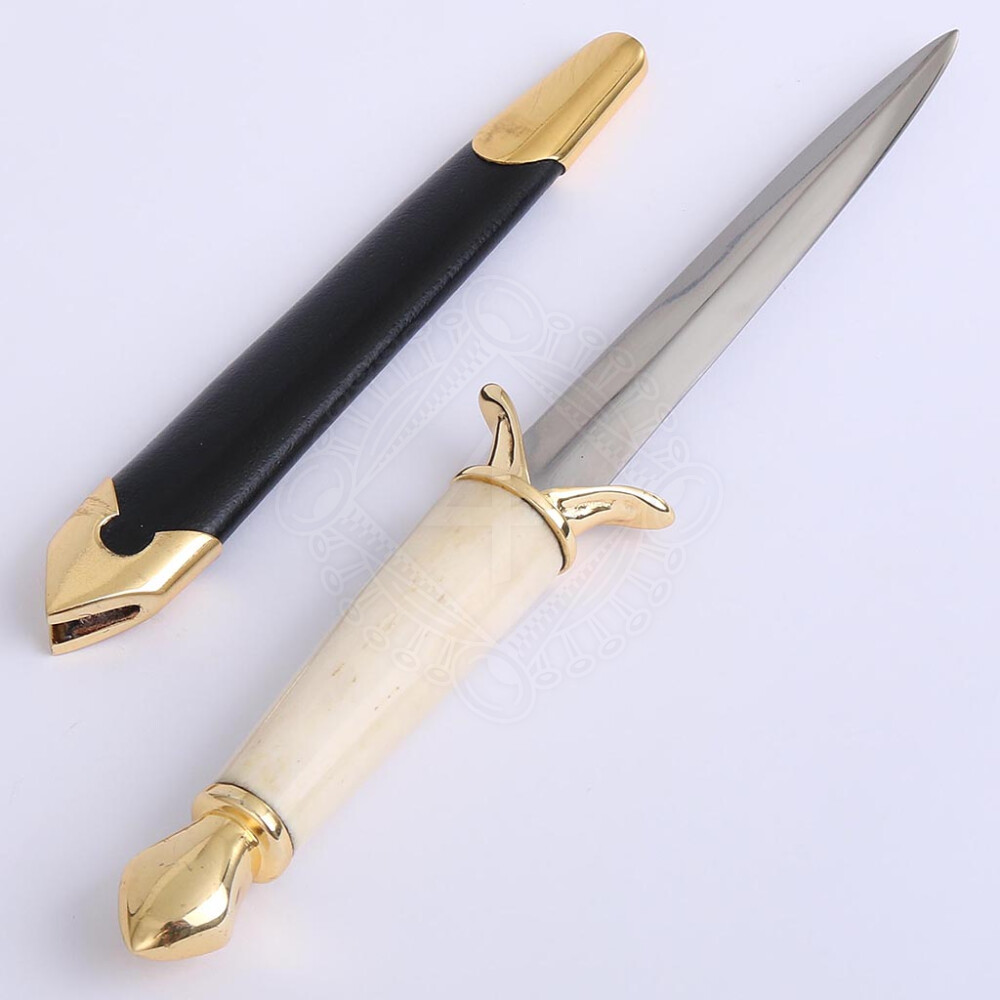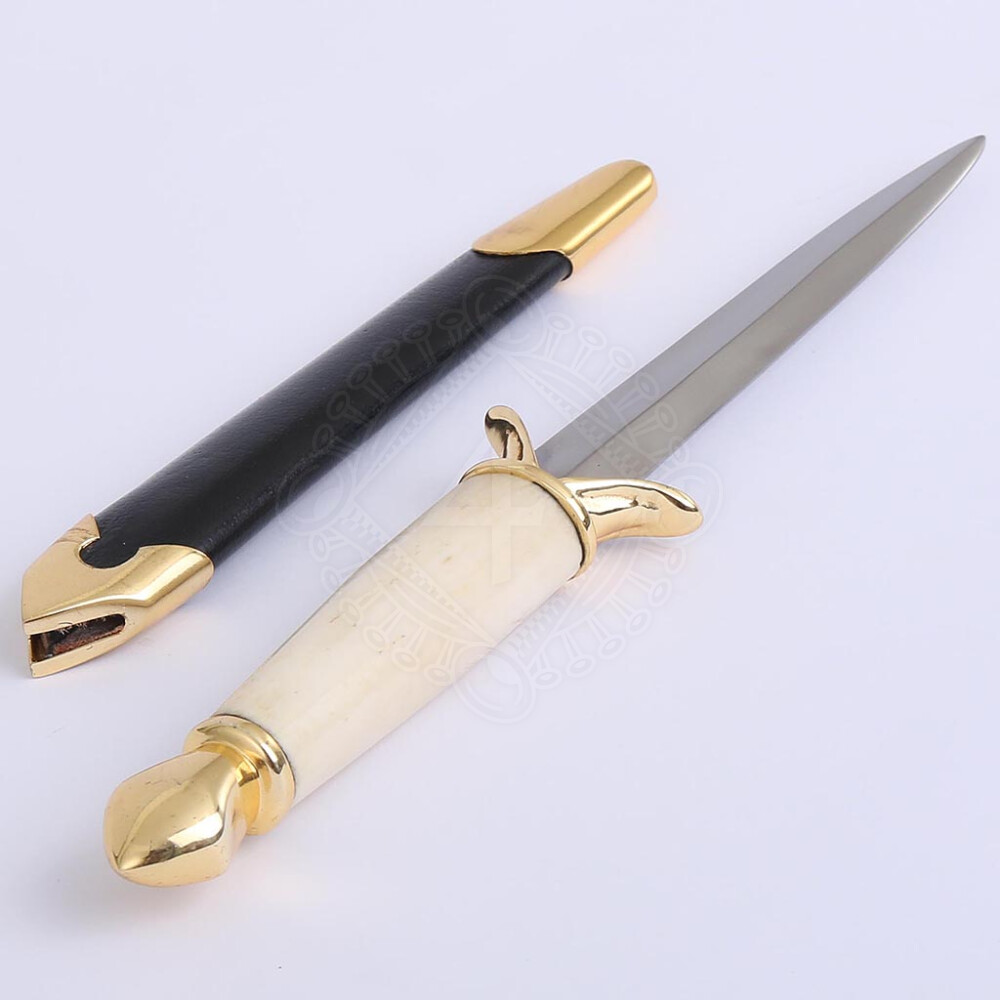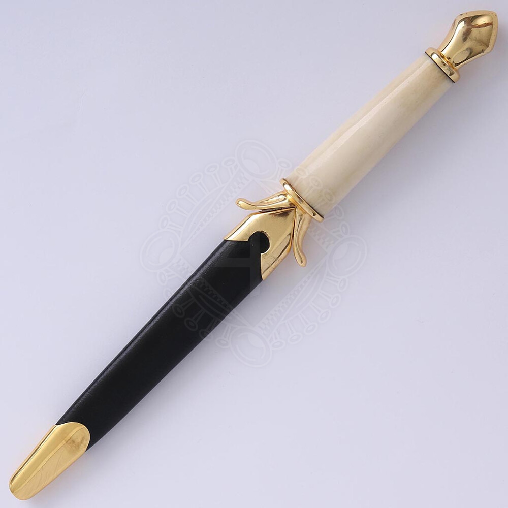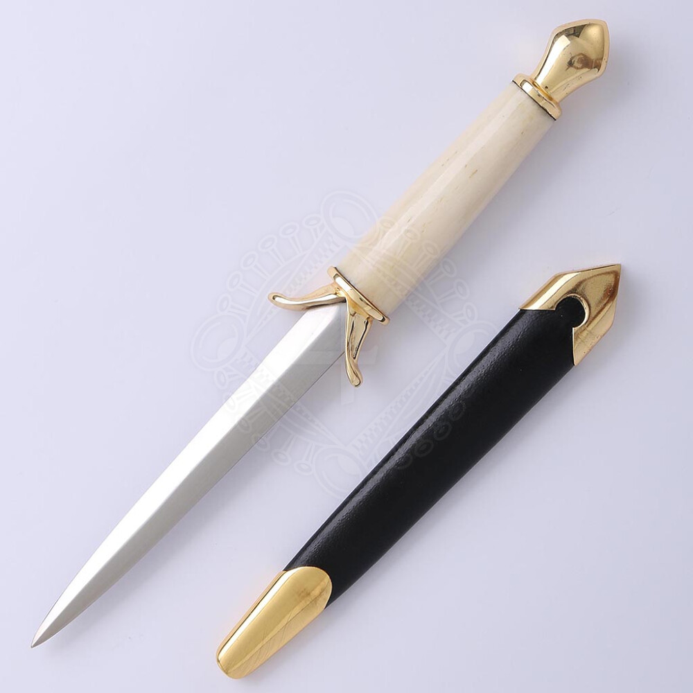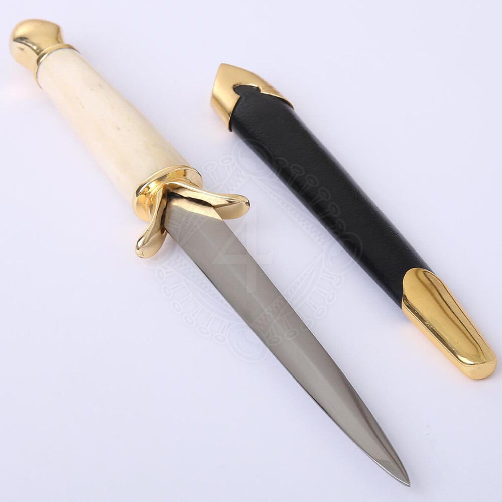 Toto atraktivní dámská dýka se krásně schová v živůtku nebo holeni holínky. Použití je též možné jako otvírač na dopisy ve vaší kanceláři. Tato šikovná malá zbraň je ostře nabroušená. Mosazné části jsou zlacené, zatímco rukojeť je z leštěné velbloudí kosti. Dodává se s pochvou se zlaceným obústkem a nákončím.