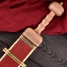 Pochva, kterou spolu s mečem obdržíte, je vyrobena ze dřeva, potažená červenou kůži a zpevněná mosazným rámem a přepásáním.
