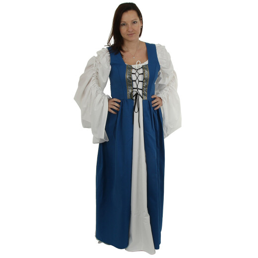 1xTyto barevně nádherné vrchní šaty ve stylu 16. století by měla mít ve své truhle na šaty každá děvečka. Otevřené šaty bez rukávů mají na prsou šněrovačku s ozdobným olemováním a silnou výztuží pro extra utažení. Používají se v kombinaci s košilkami, spodními šaty a spodničkami a mohou být nošeny od léta do zimy. Nabízíme také v červené či zelené barvě. Více informací k produktu ...