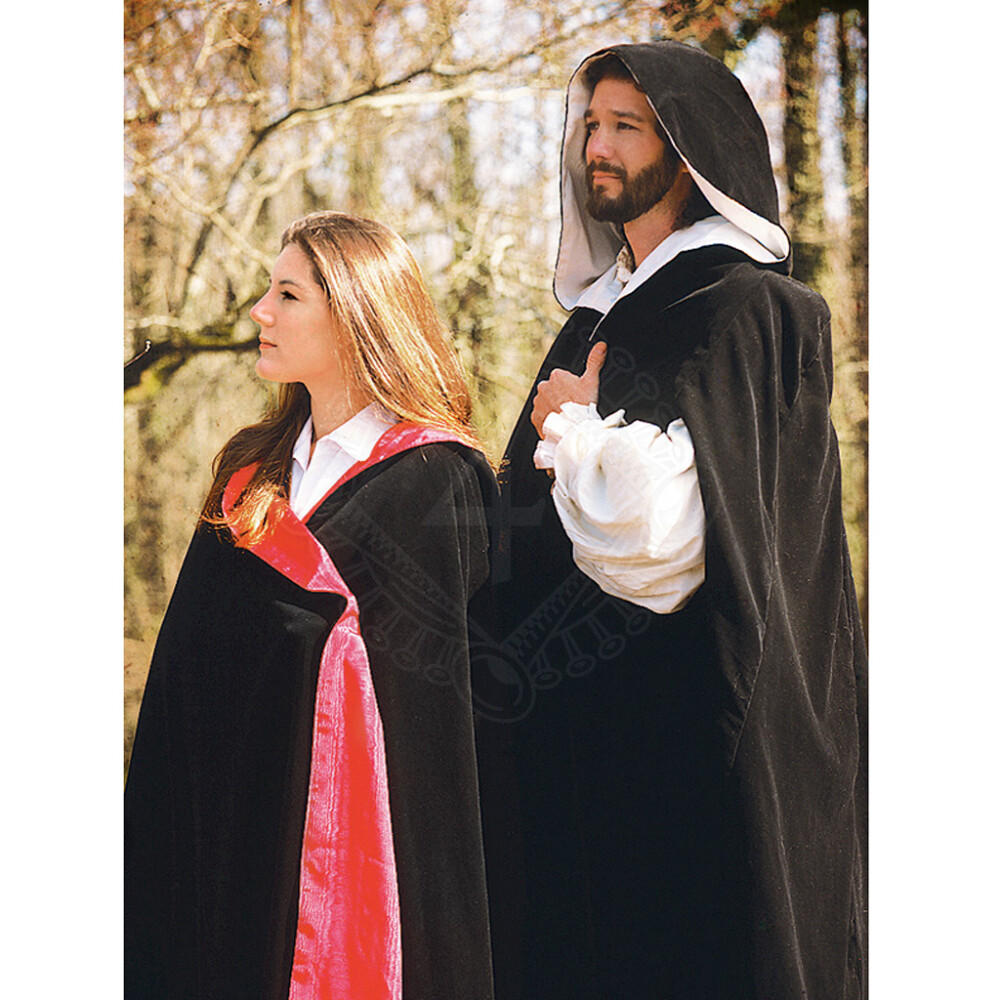 Tento sametový plášť se široce střiženou kapucí je zhotoven z ušlechtilého těžkého bavlněného sametu. Každému dodá tajemný vzhled a auru mysticismu. Kabát se nedá zapnout a jeho váha elegantně spočívá na ramenou. Černý plášť je vypodšívkován fialovým, červeným či bílým saténem. Má postranní rozparky na rukávech a měří od ramenního švu ca. 126cm. Více informací k produktu ...